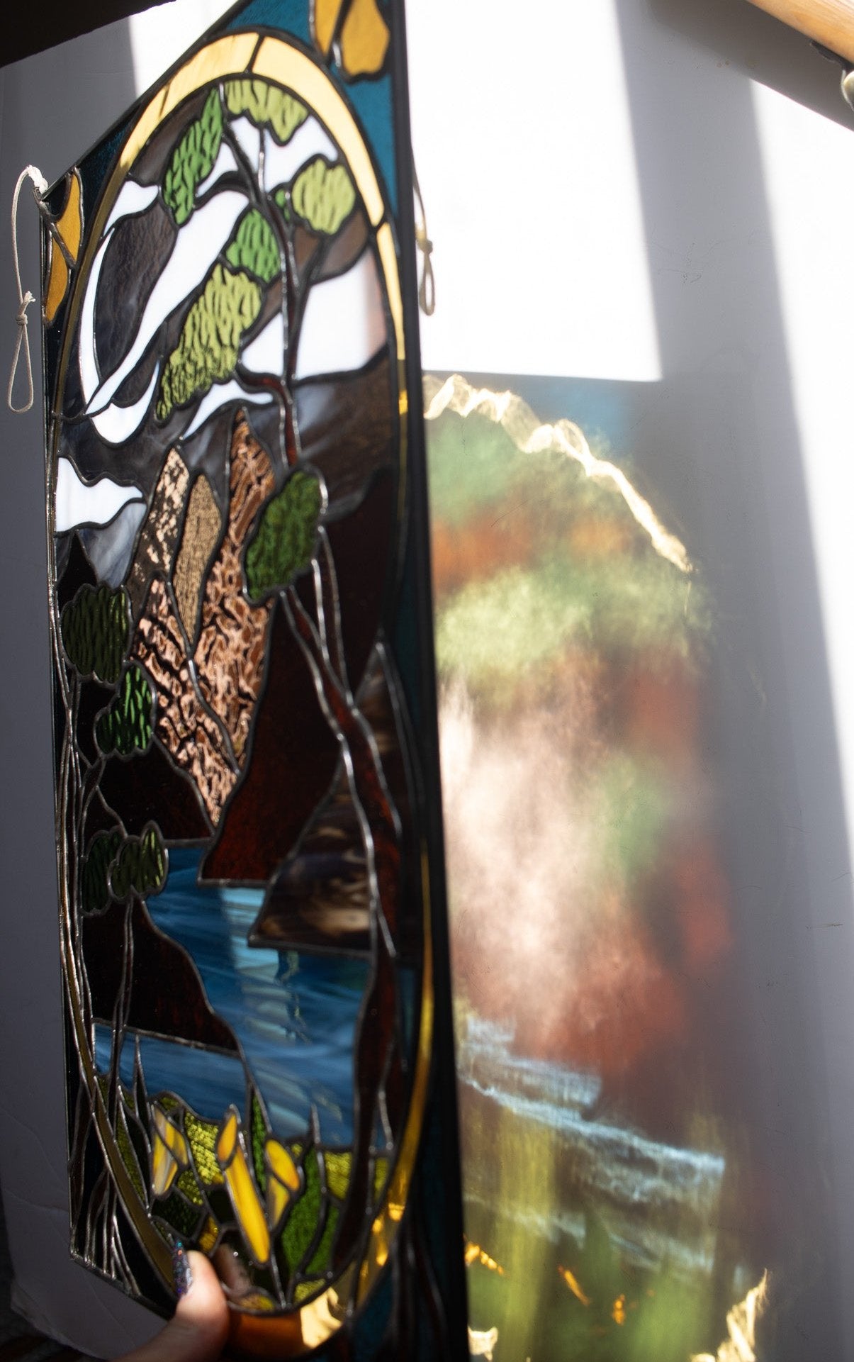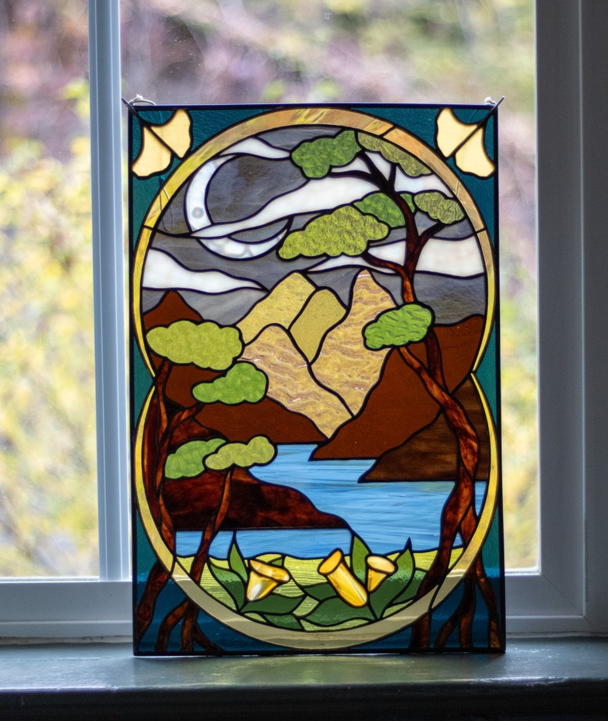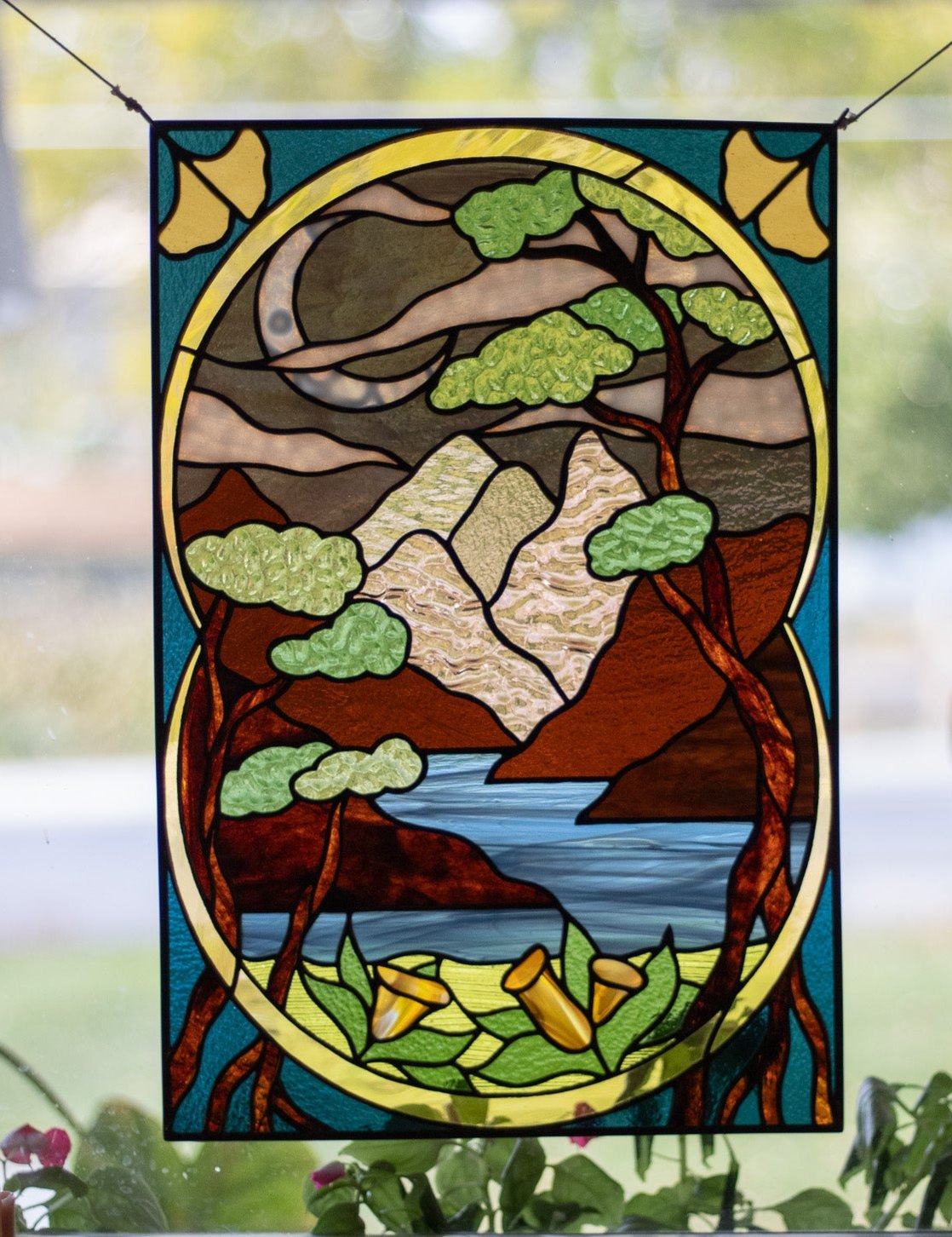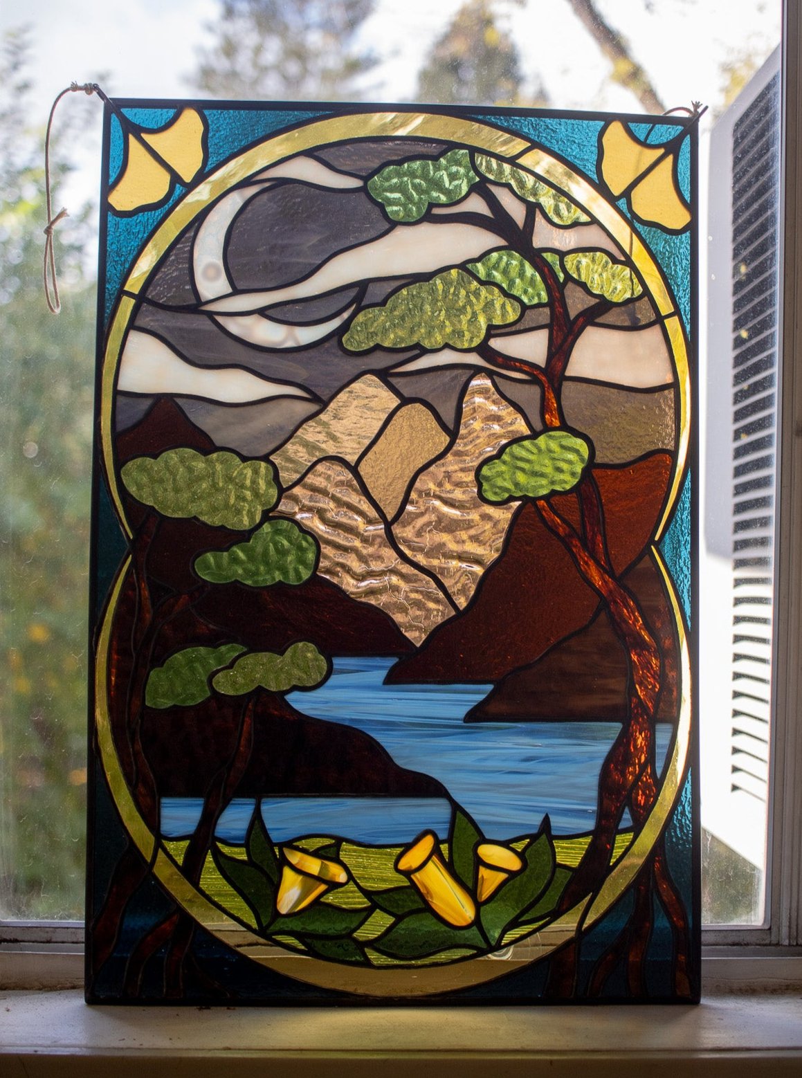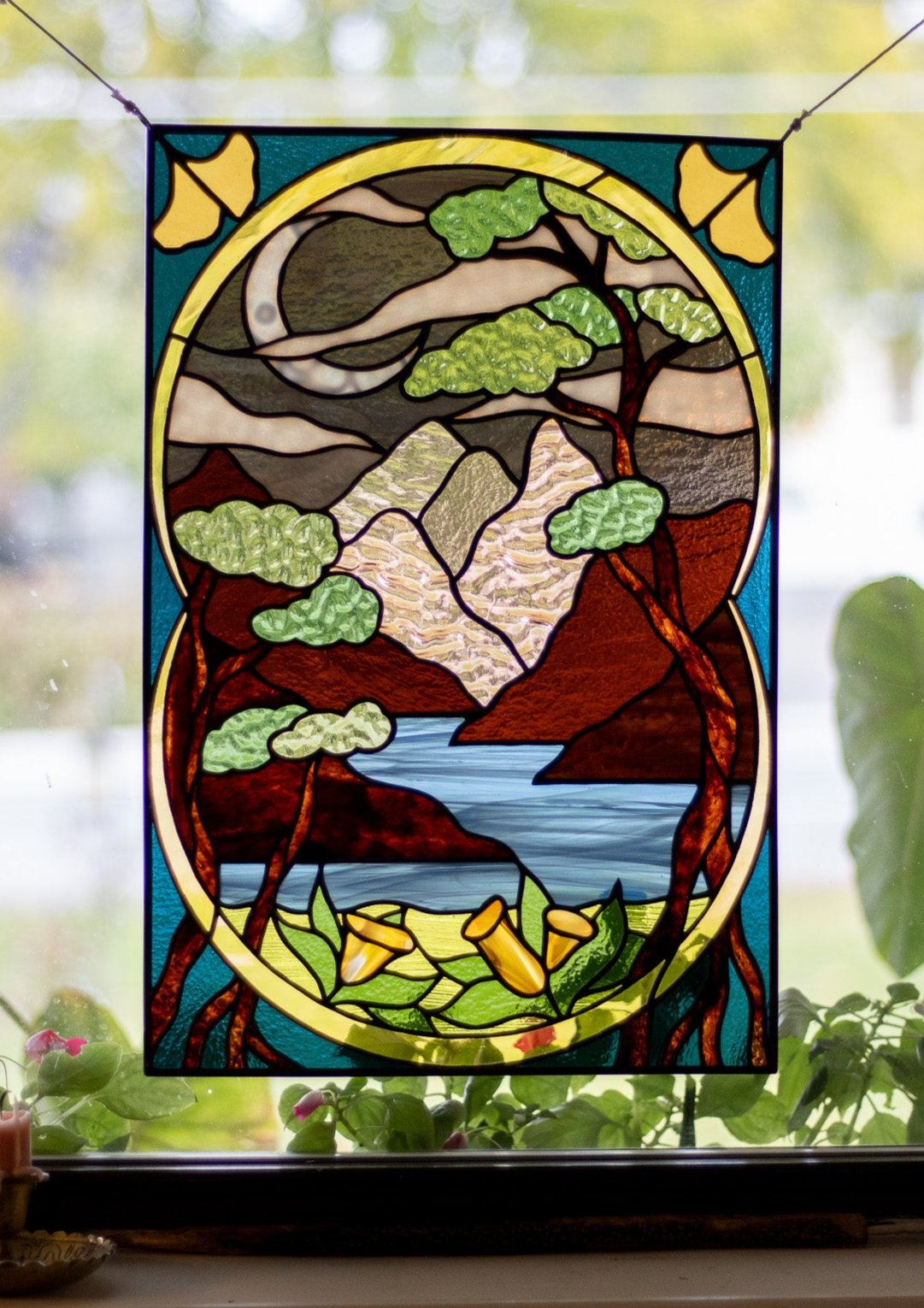 This piece is inspired by Art Nouveau style landscape paintings. It is made with different colors of hand-cut stained glass that have been soldered together with lead-free solder and surrounded by zinc came that has been antiqued black. It measures 17 inches by 11.5 inches.