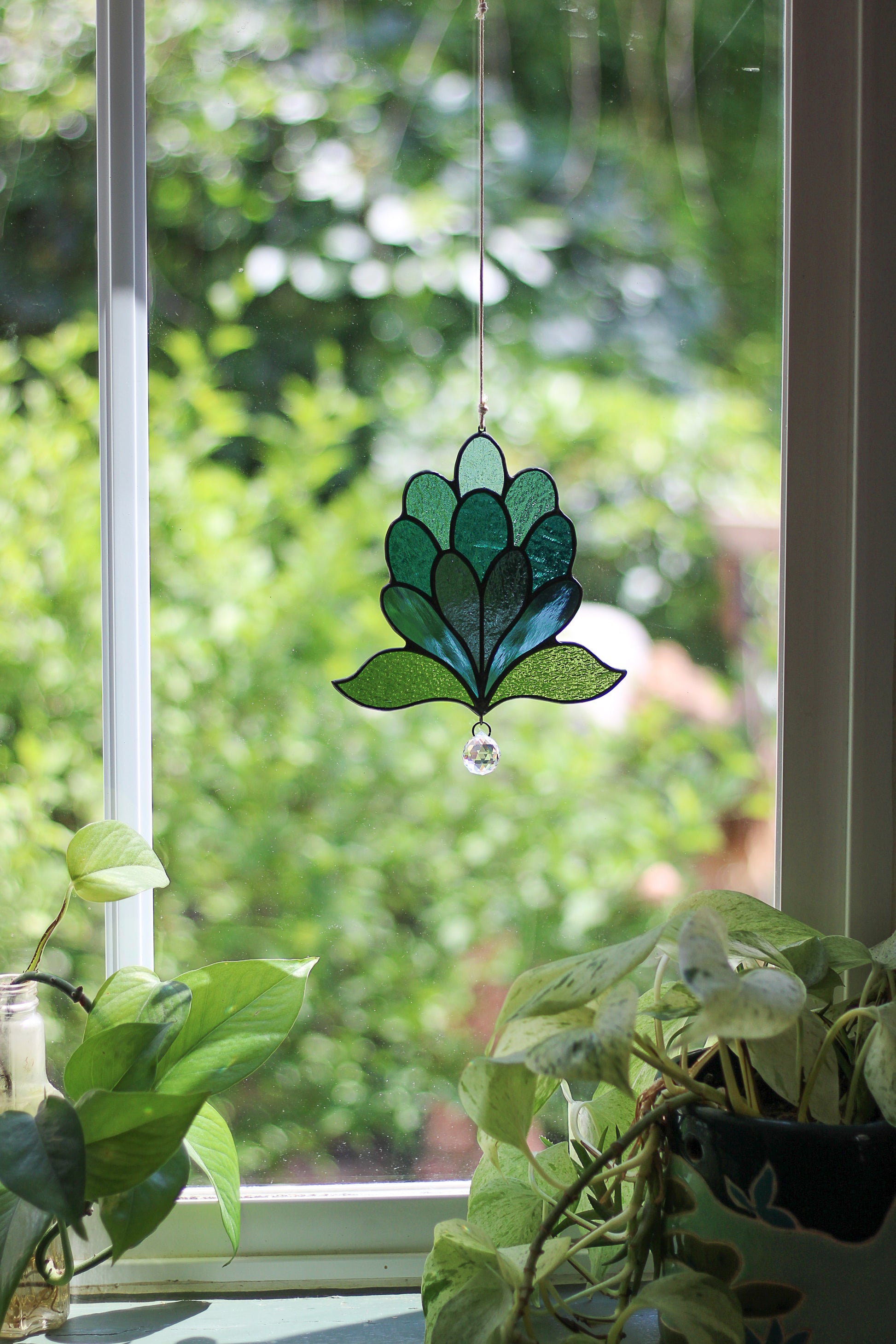This sun catcher depicts a simple blue bubbly flower with a rainbow maker crystal hanging from the bottom. It is soldered together using lead free solder with a silver finish. This sun catcher measure 6" x 6" not including the cord or crystal.