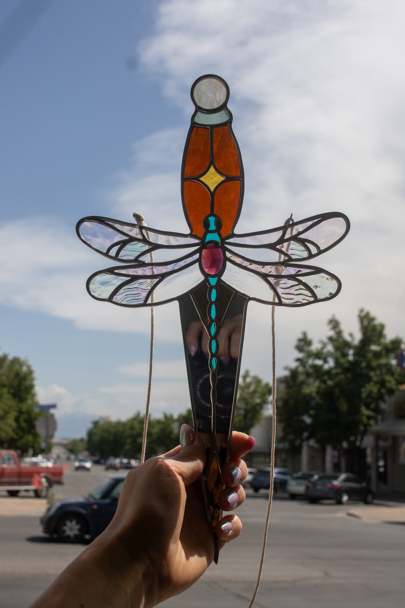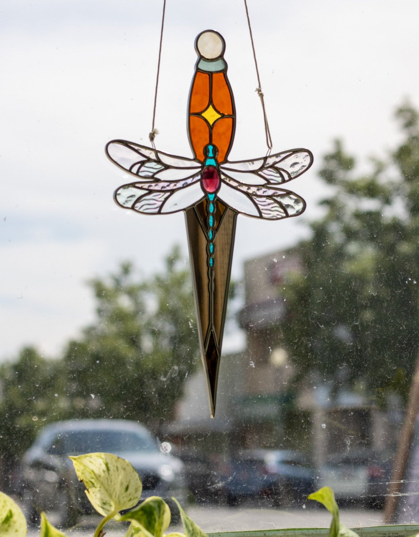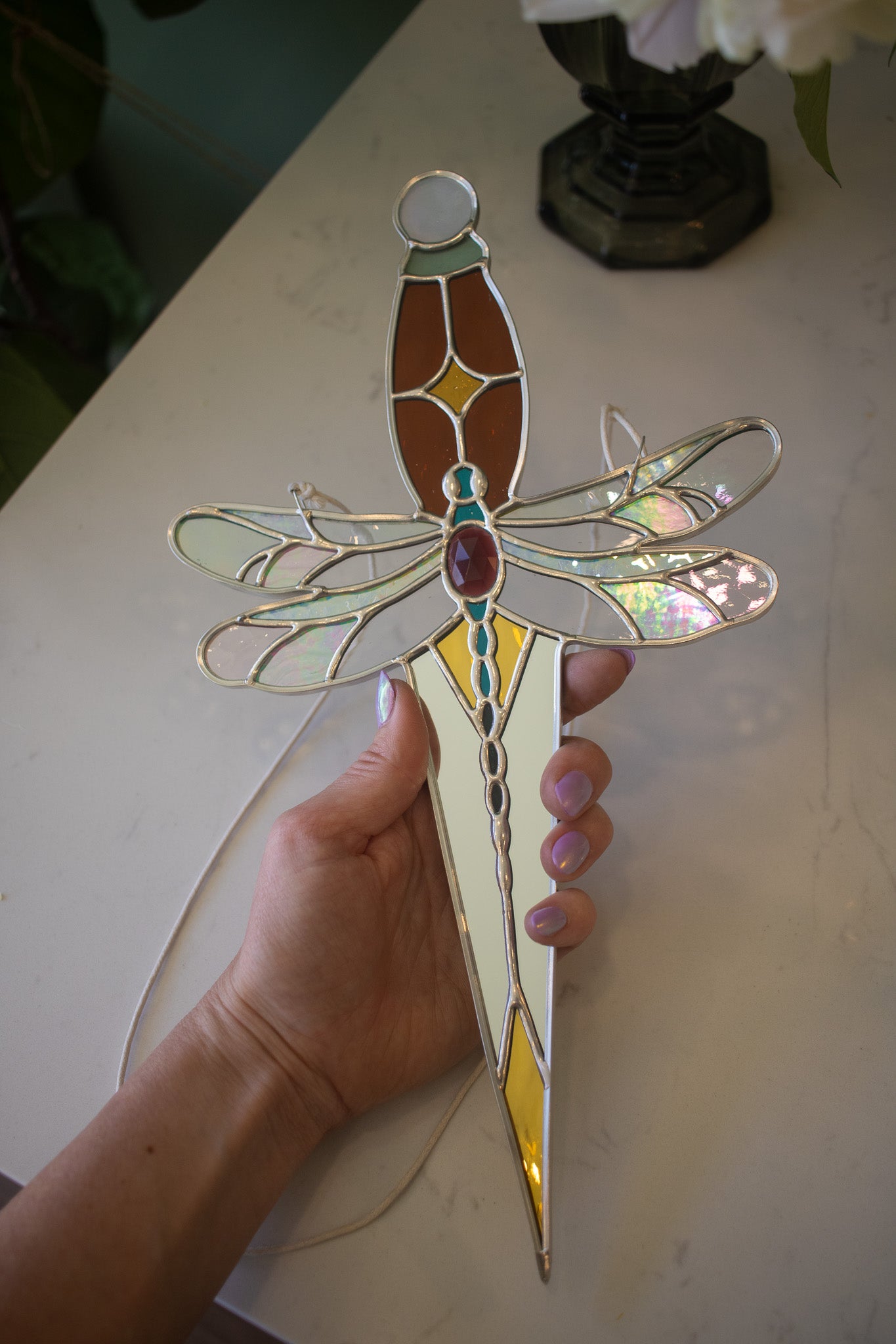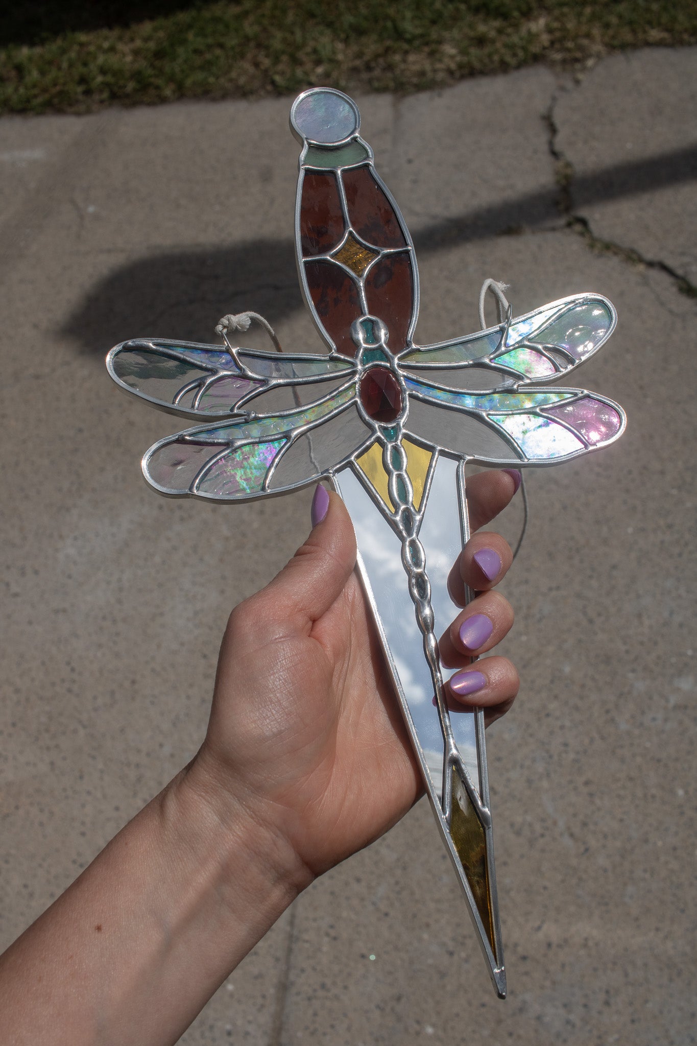 This stained glass piece depicts a dagger made with gold and silver coat mirror glass and a stained glass dragonfly handle with iridescent wings. It is soldered with lead-free solder and framed in lead-free came.