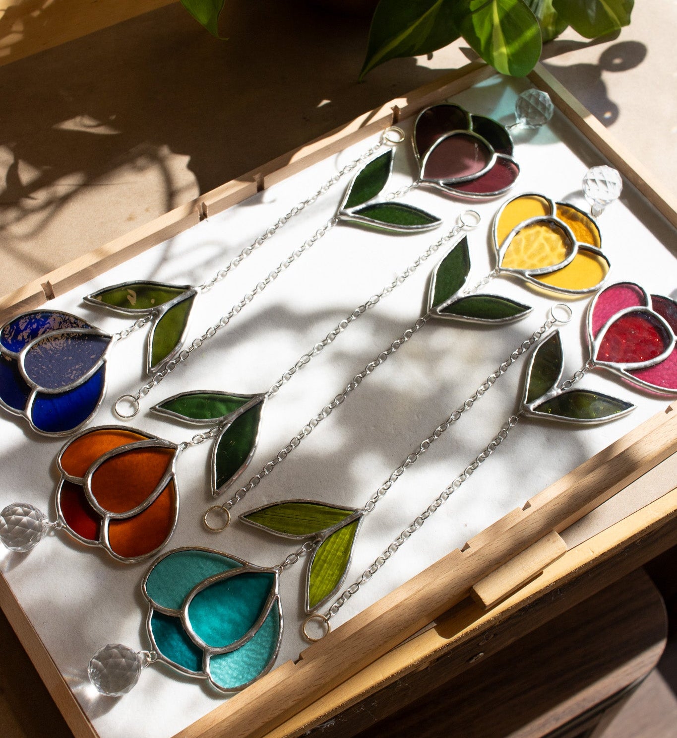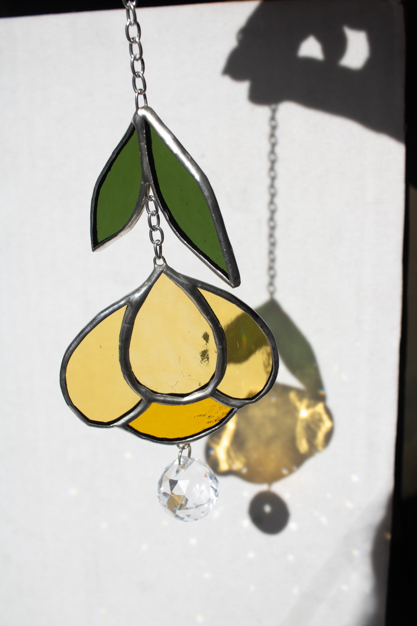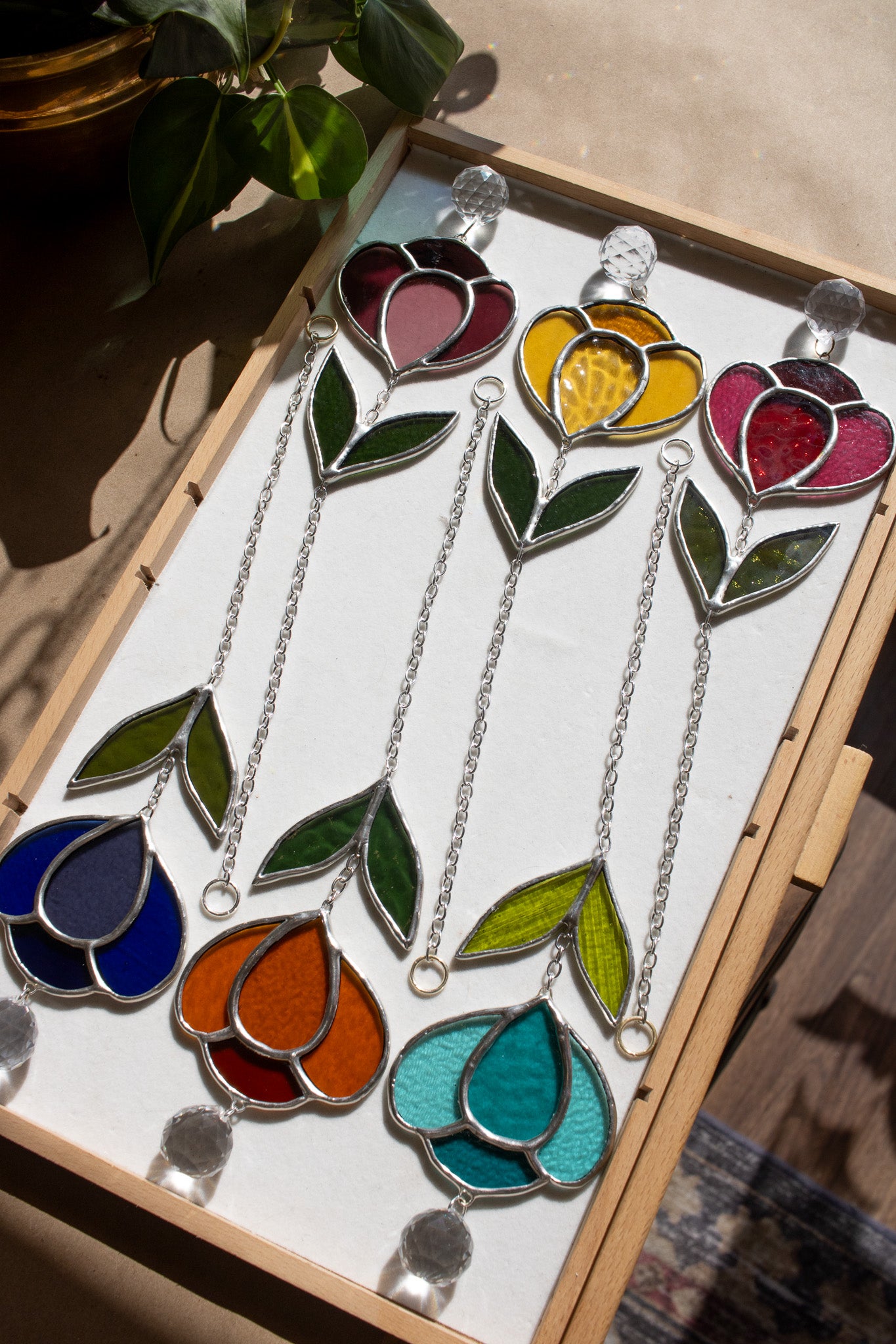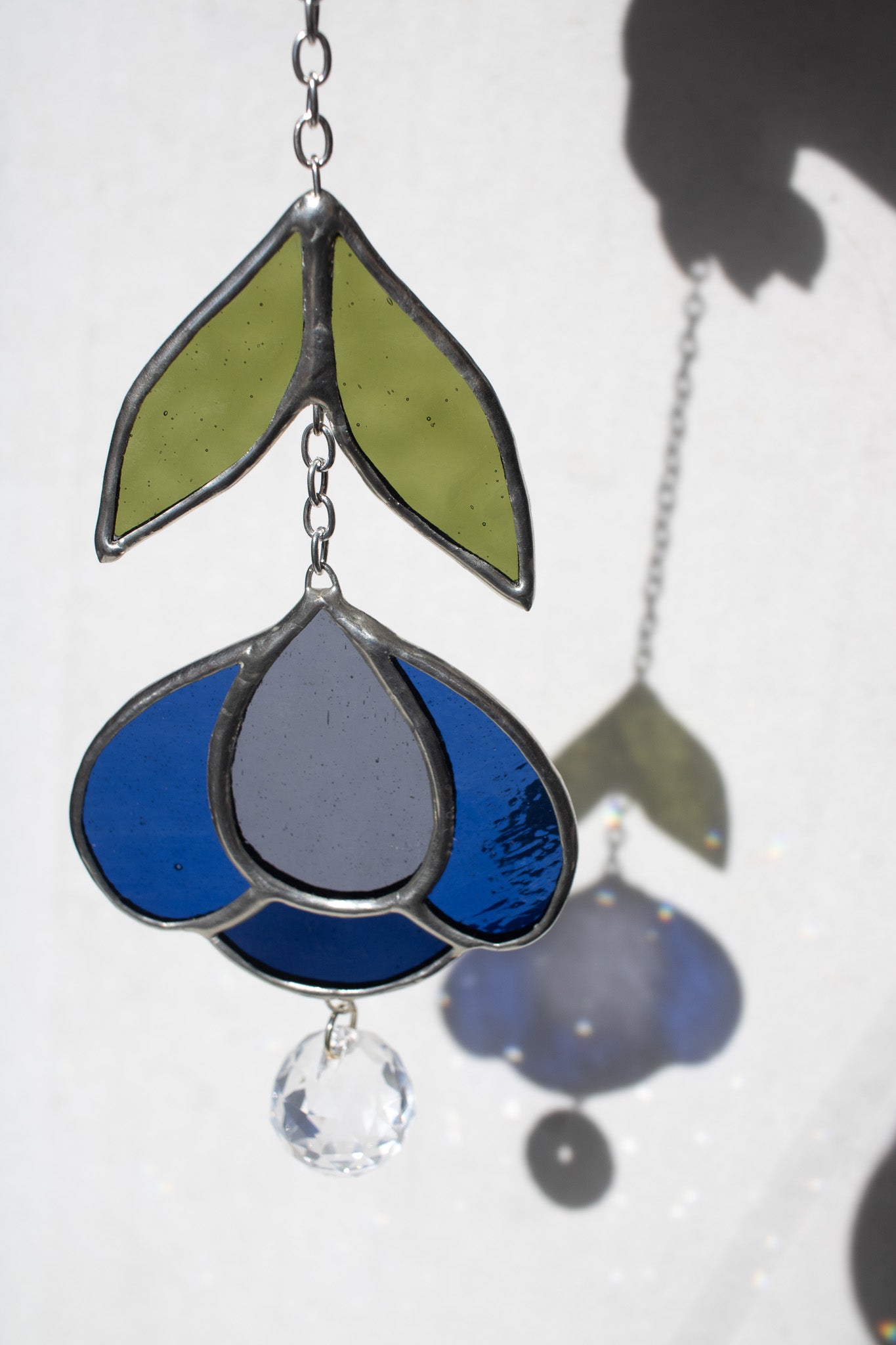 This suncatcher depicts a hanging flower. It is made with different colors of hand-cut stained glass that have been soldered together with lead-free solder. A small rainbow making crystal drop has been attached to the bottom of the piece. It measures 11" long by 3" wide, including the chain it hangs from, and the crystal drop.