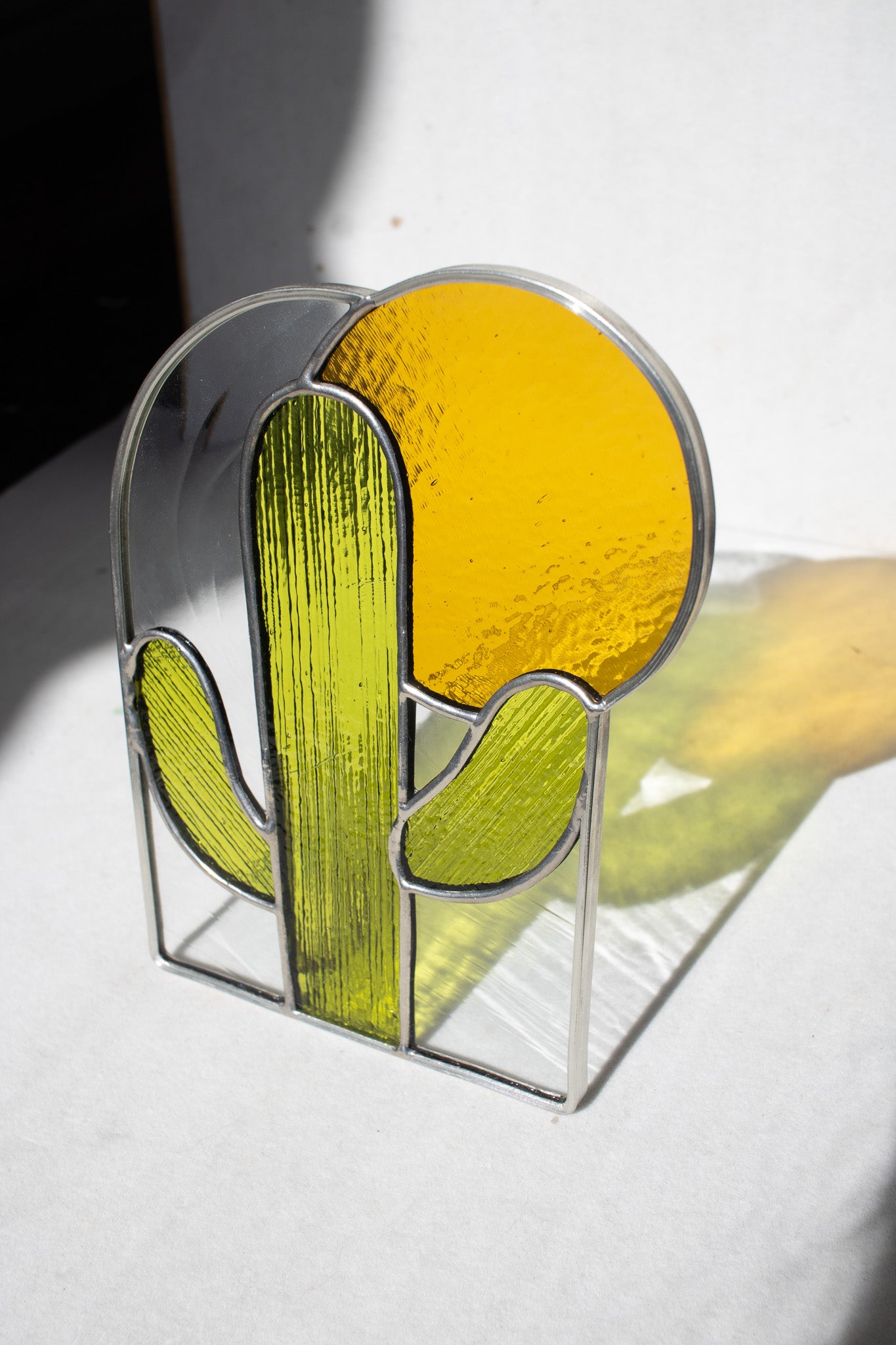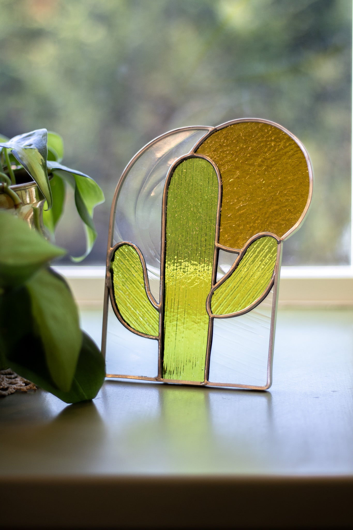 This sun catcher depicts a simple Saguaro cactus in front of a desert sun. It is soldered together using lead free solder with a silver finish, and has a brass rod soldered into the back allowing it to stand on its own. This sun catcher measures 5" x 6".