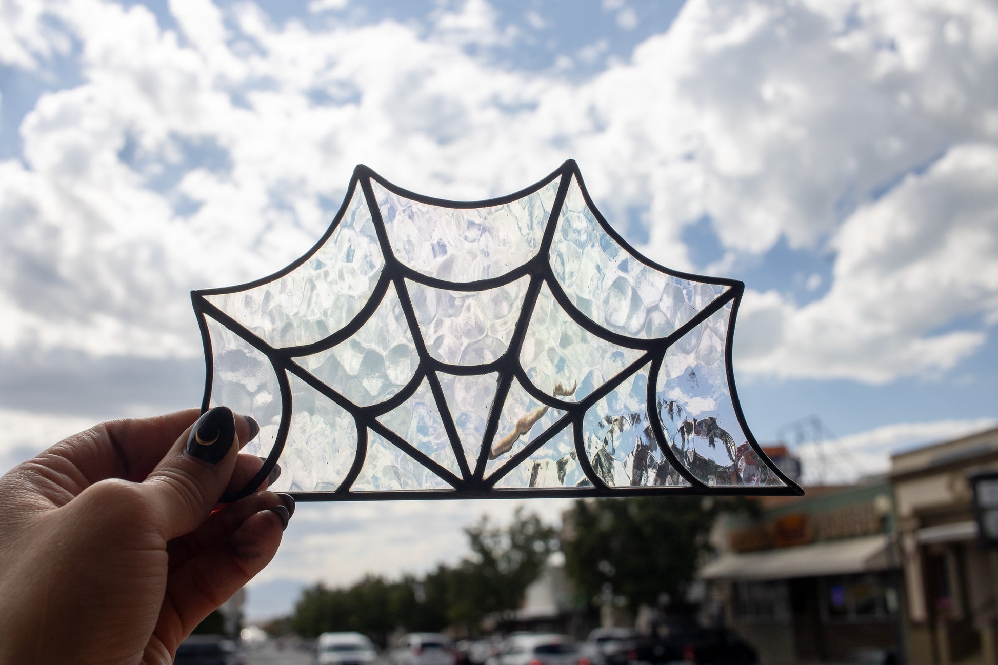 This free-standing spider web is made with clear iridescent glass. It is soldered with lead-free solder and surrounded by a zinc came frame that has been patinaed black. There is a brass rod soldered into the back that allows it to stand on its own. It measures 7.5 inches by 4 inches.