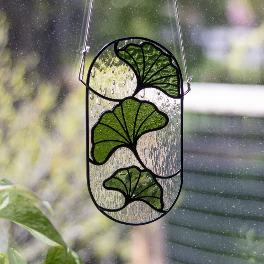 This suncatcher depicts three green falling ginkgo leaves made various colors and textures of green glass surrounded by clear raindrop textured glass. It is soldered with lead-free solder, is framed in zinc came and measures 4 inches by 8 inches, not including the cord it hangs from.