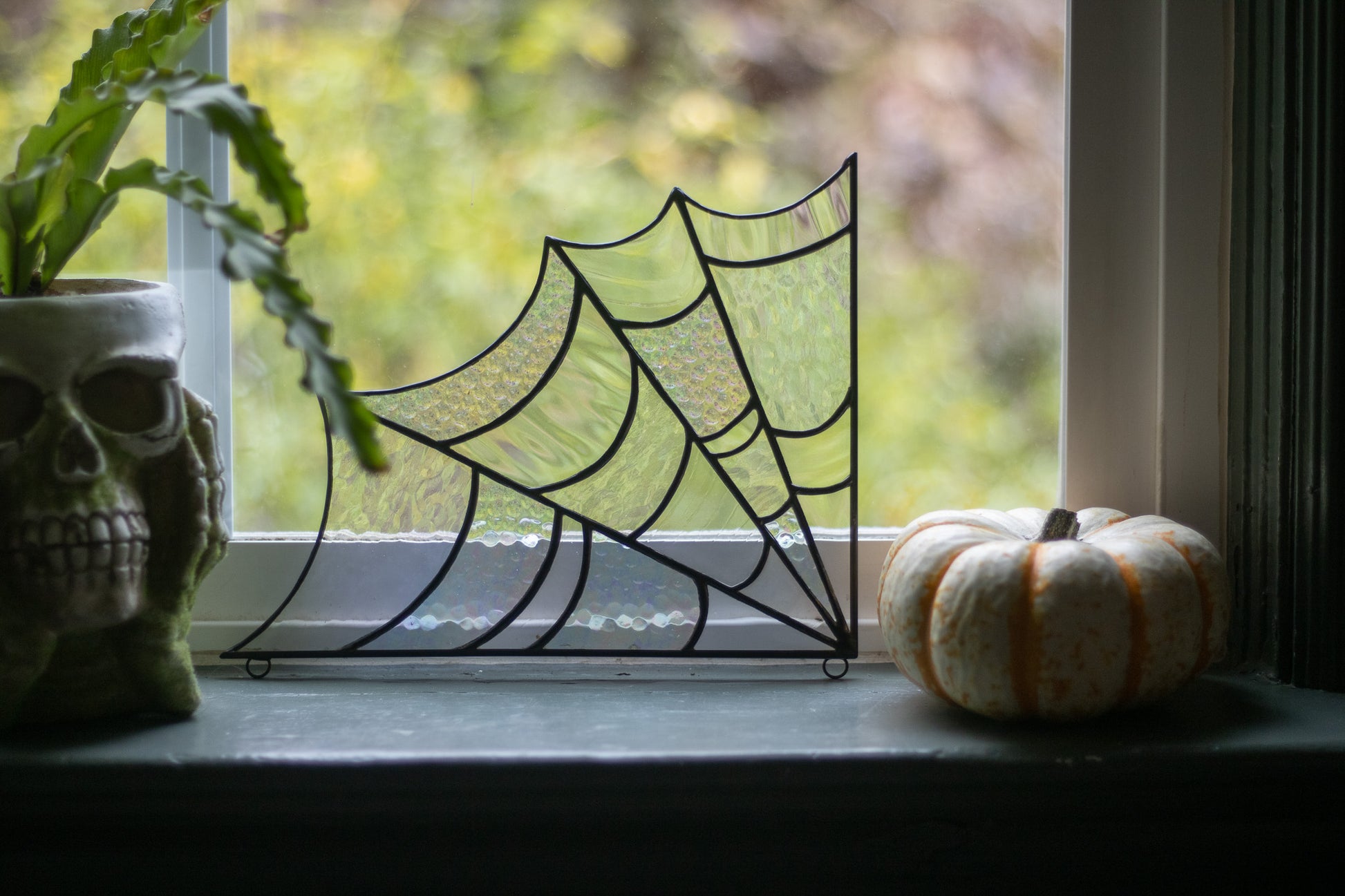 This is a corner hanging asymmetrical spider web featuring different textures of clear glass, some with iridescence, soldered with lead-free solder and a zinc frame that has been antiqued black. There are two loops soldered on the zinc frame to hang the web from. It measures 10 inches by 8 inches. I hang it by putting two very small nails into the frame of a door way or window frame and hang the web from them.