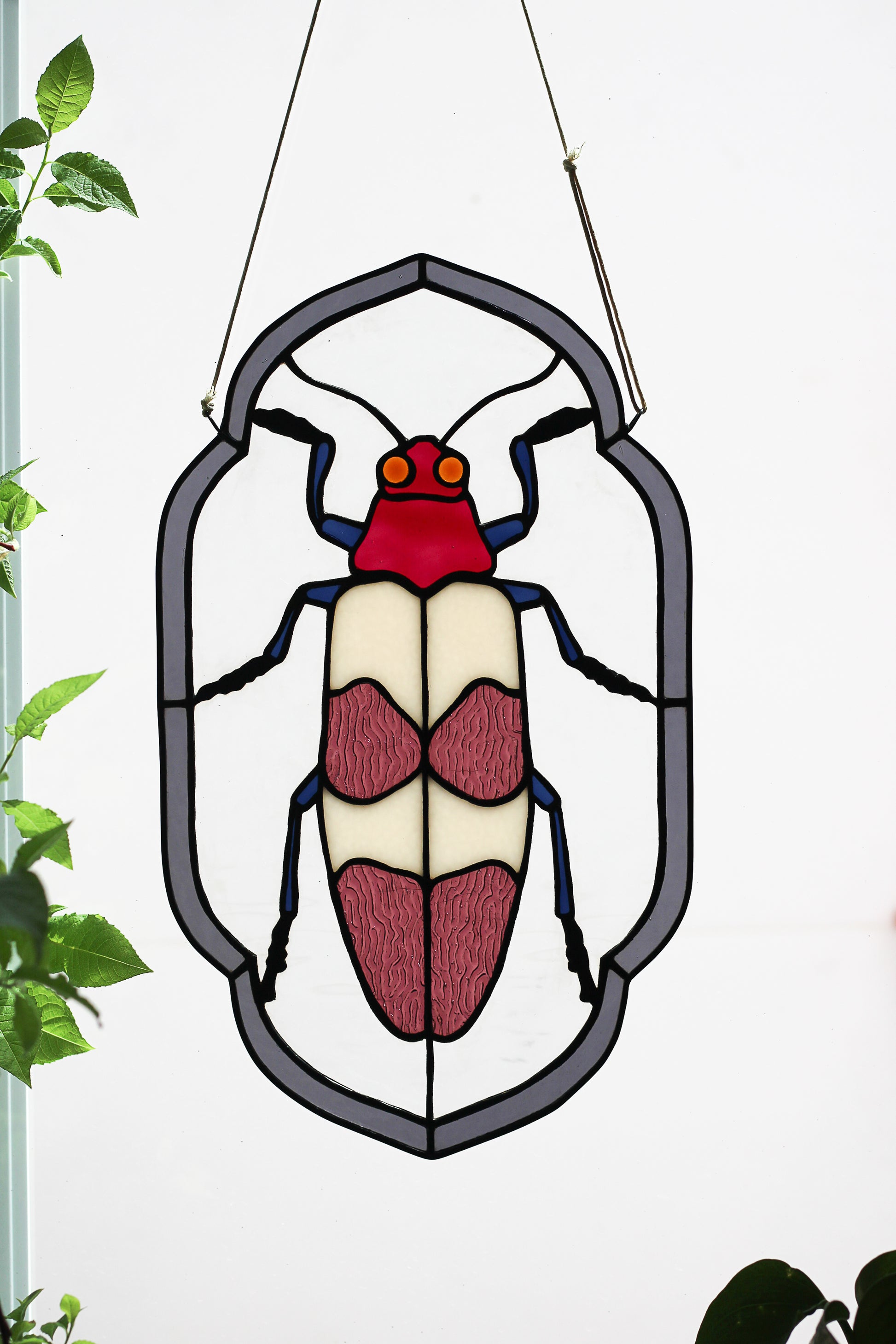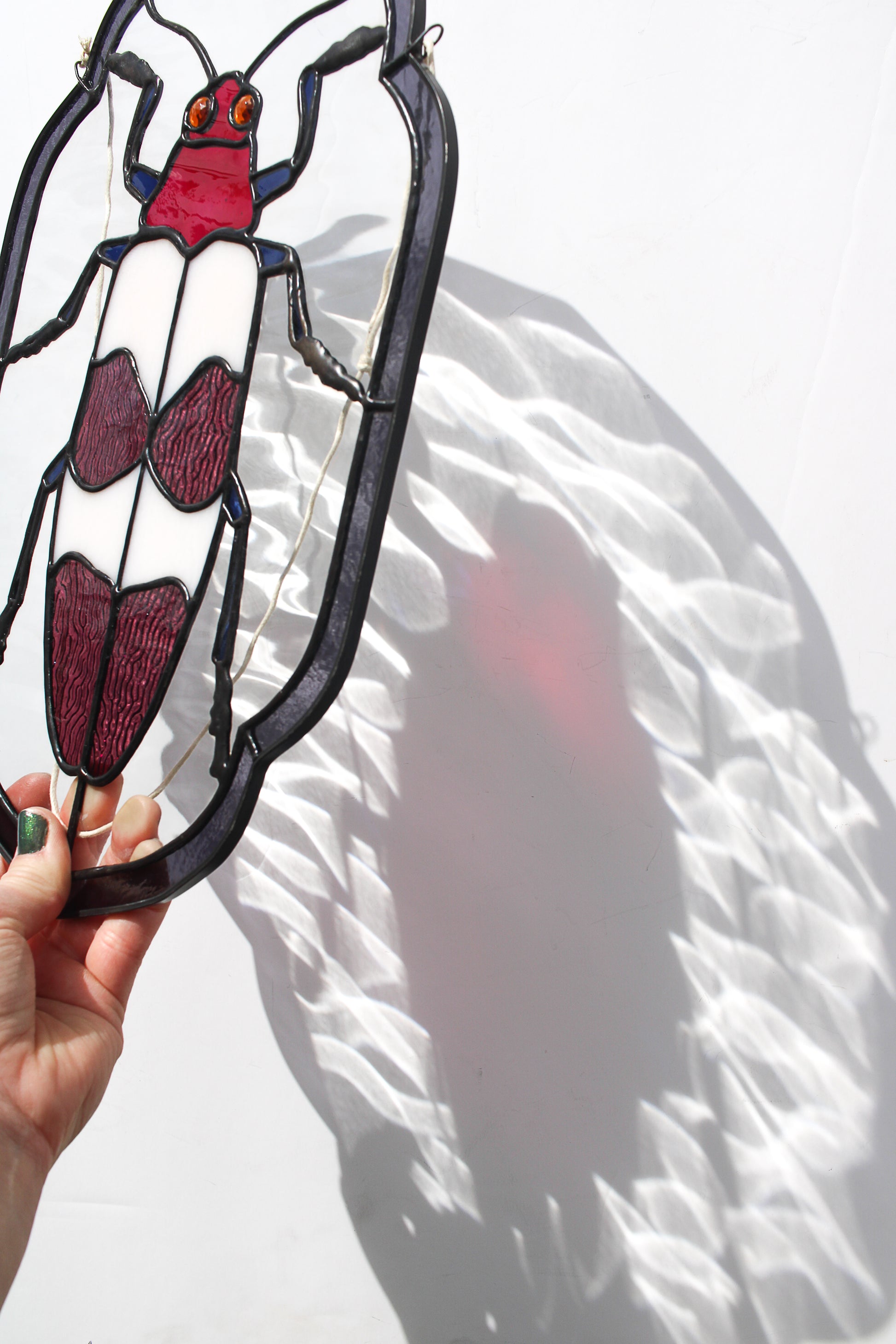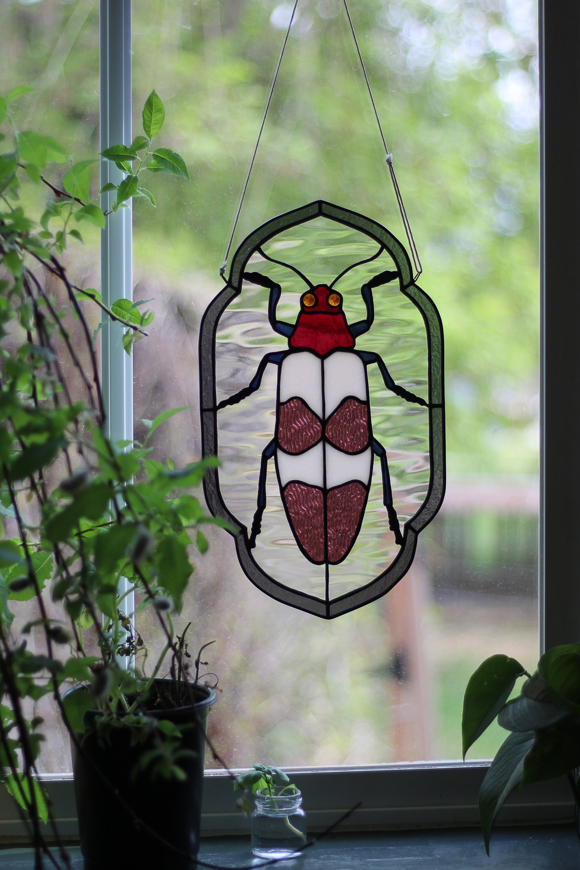 This suncatcher depicts a Chrysochroa buqueti beetle, also known as a Jewel Beetle. It is made with different colors of hand-cut stained glass that have been soldered together with lead-free solder and surrounded by came that has been antiqued black. It measures 13 inches by 7.5 inches, not including the cord it hangs from.