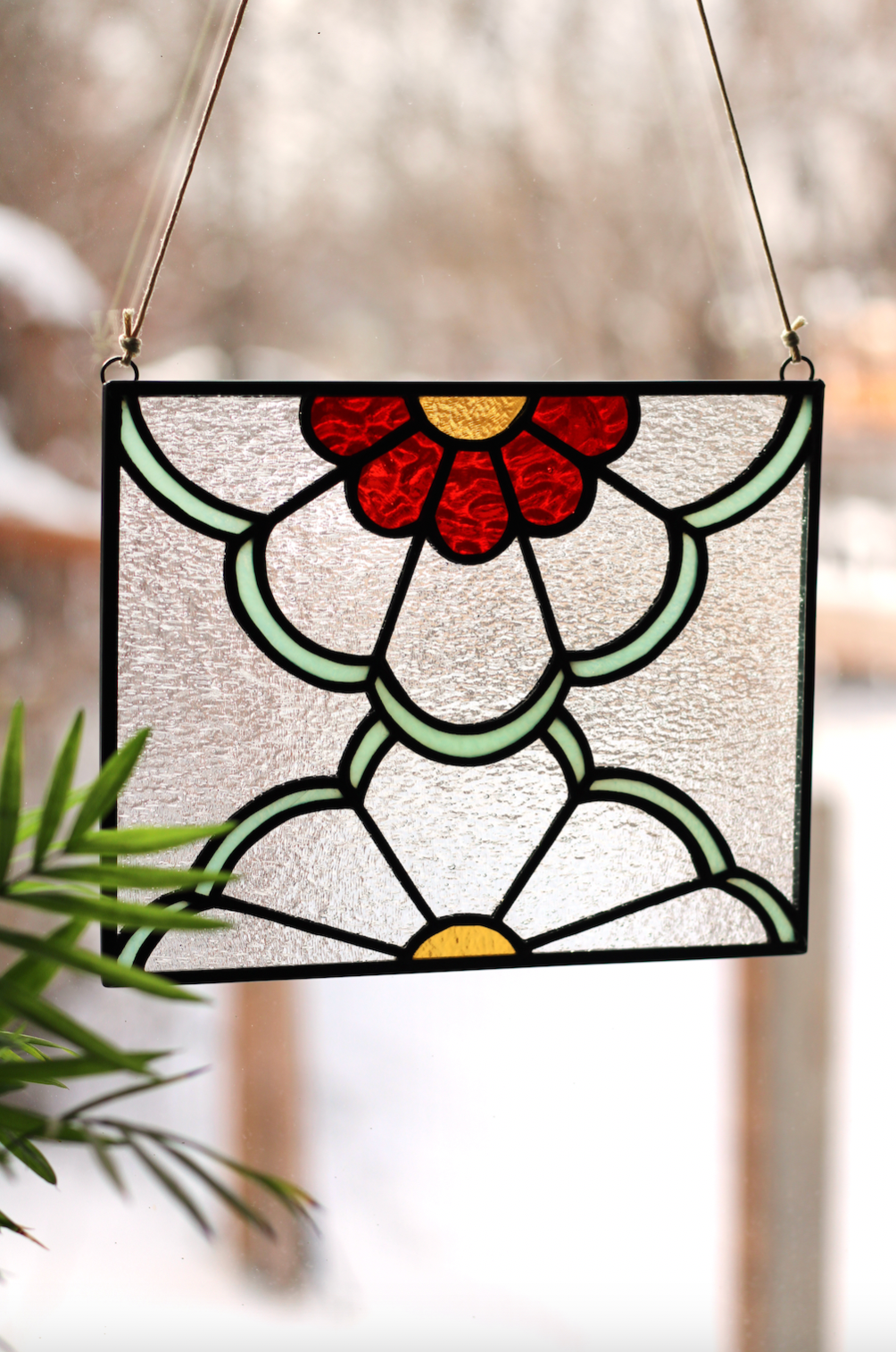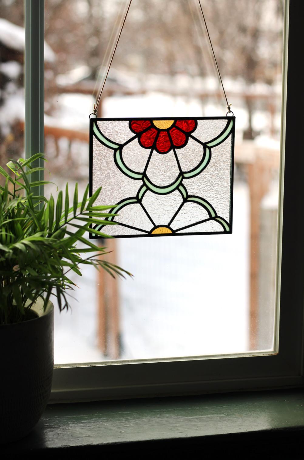 This suncatcher depicts a floral love letter with a red flower and teal accents. It is made with various colors and textures of stained glass and soldered together using lead free solder and framed in a zinc border all with a black patina. This sun catcher measure 8 x 6 inches not including the cord it hangs from.