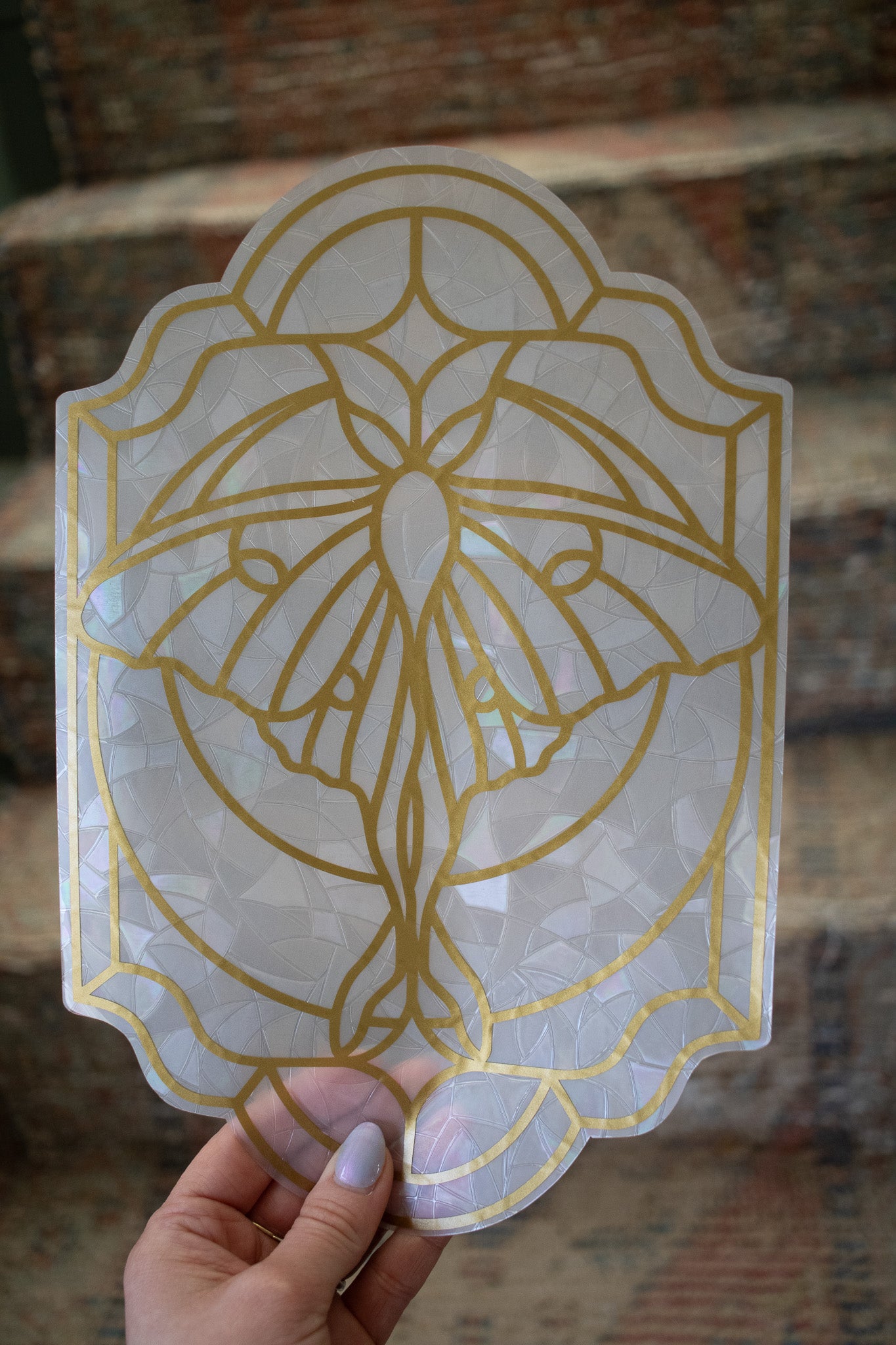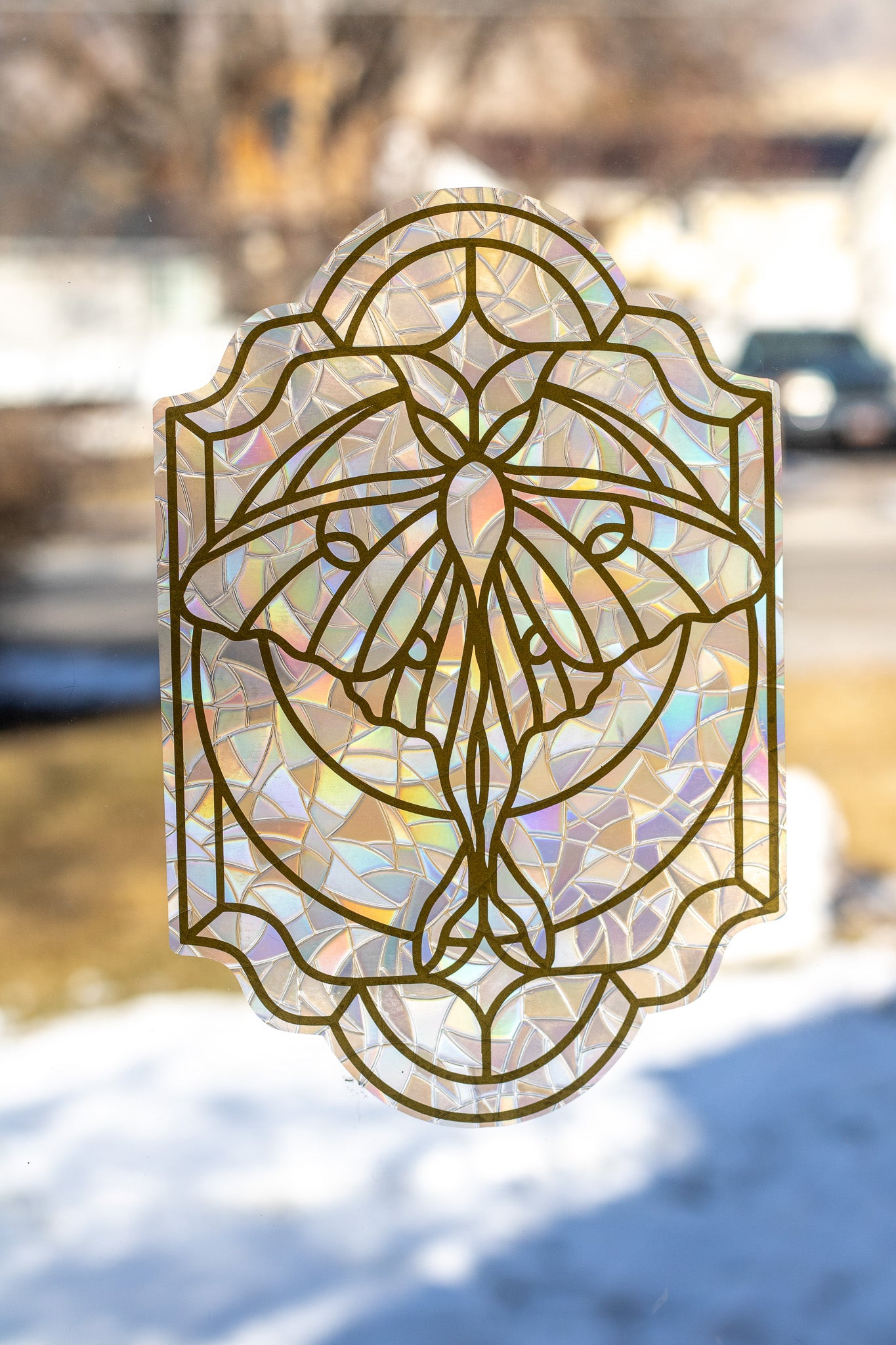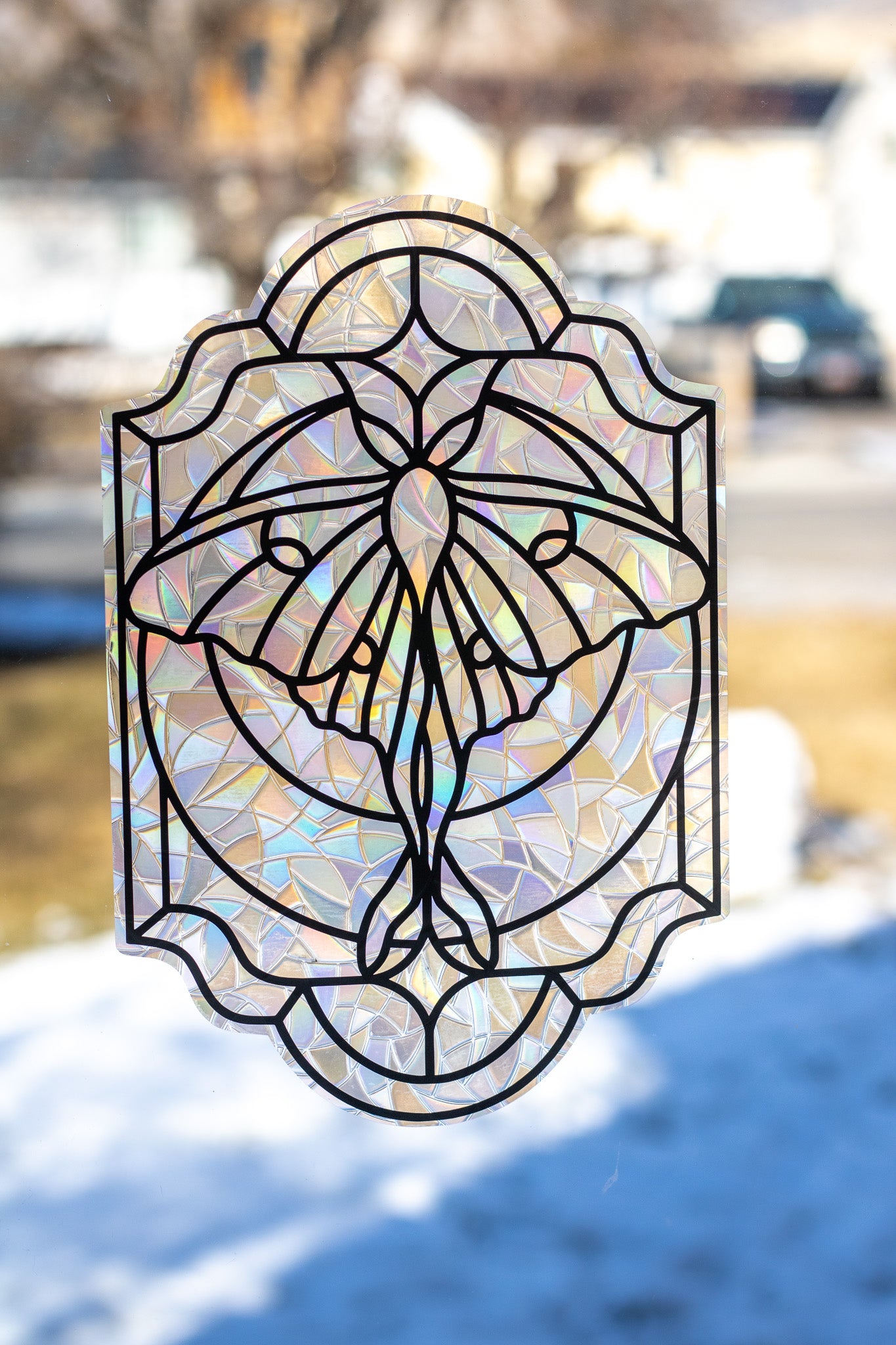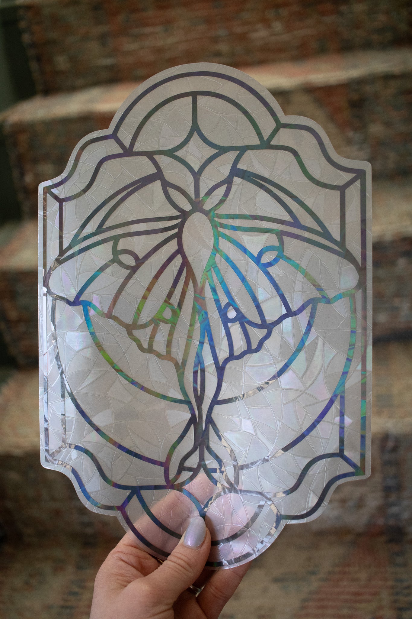 This window cling is made with rainbow making vinyl that does not contain adhesive, so it won't leave any residue on your window, and you can move it around as much as you'd like. It is in the same design as my Luna Moth Panel and measures 11" x 7.5".