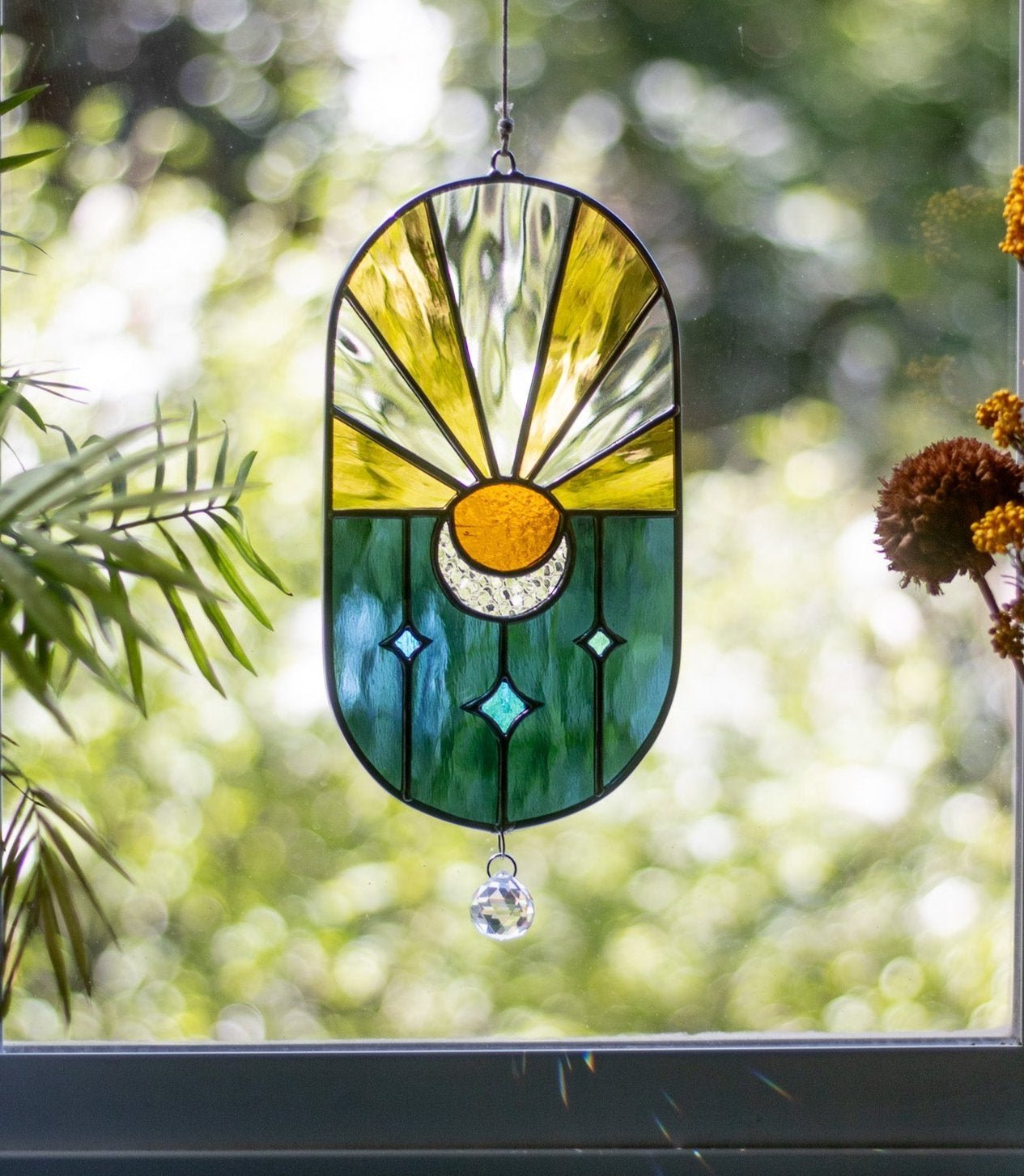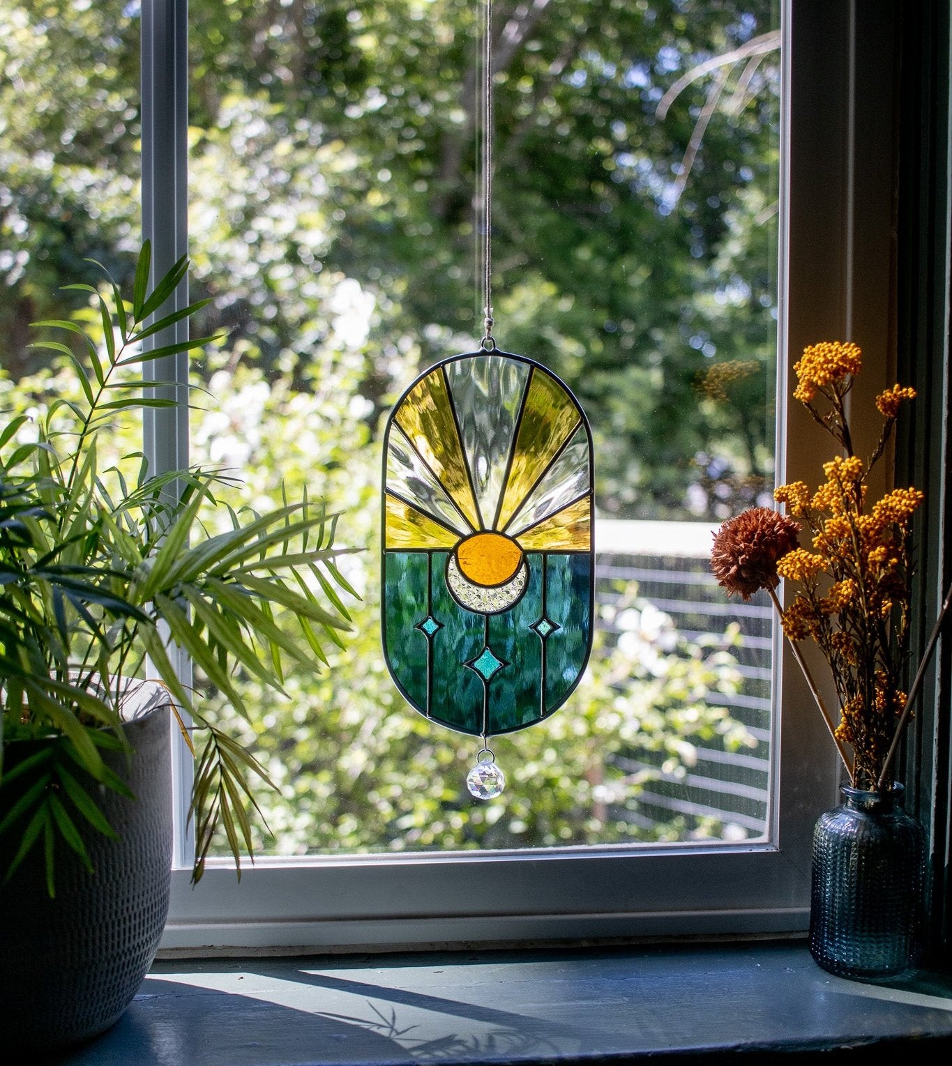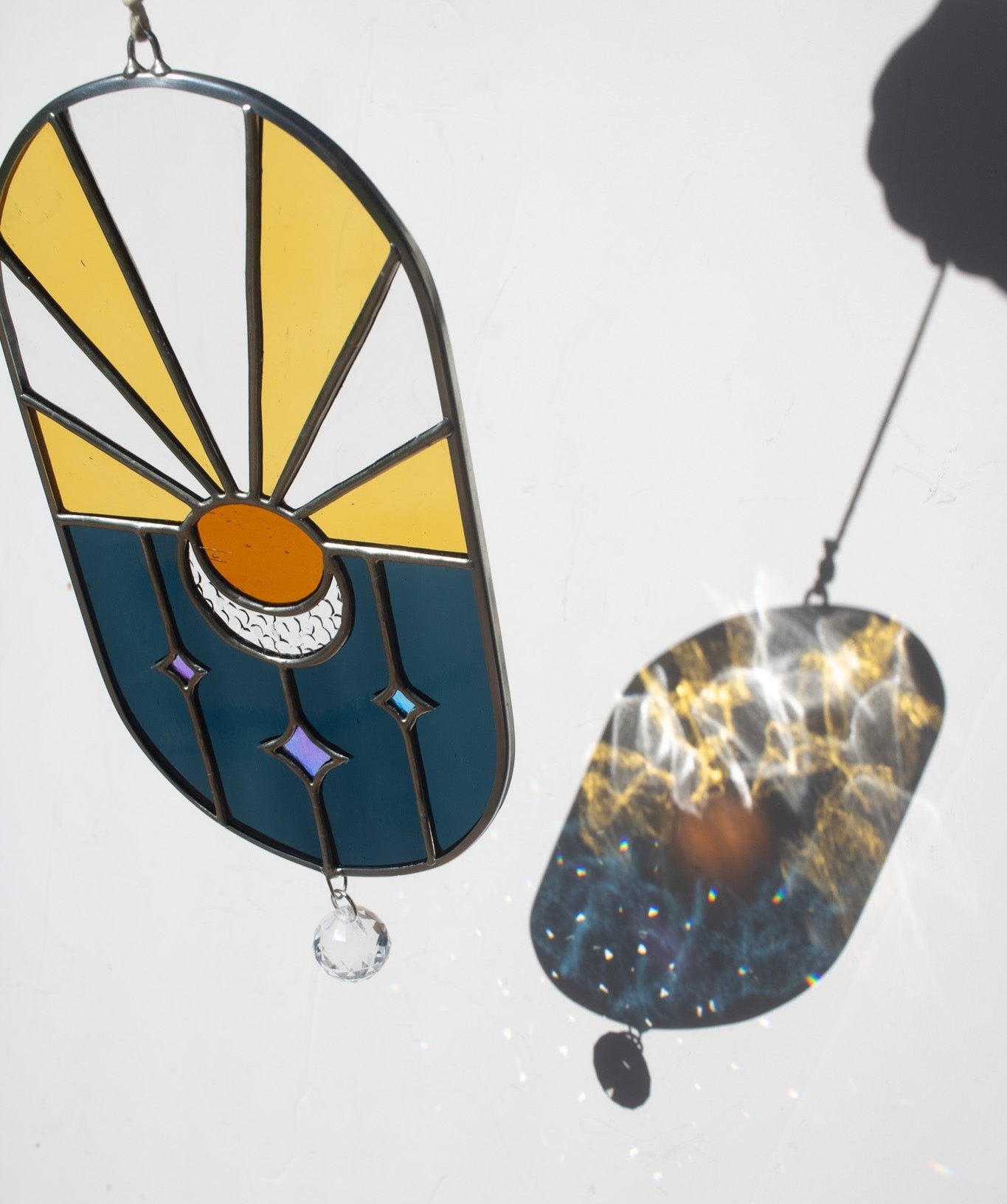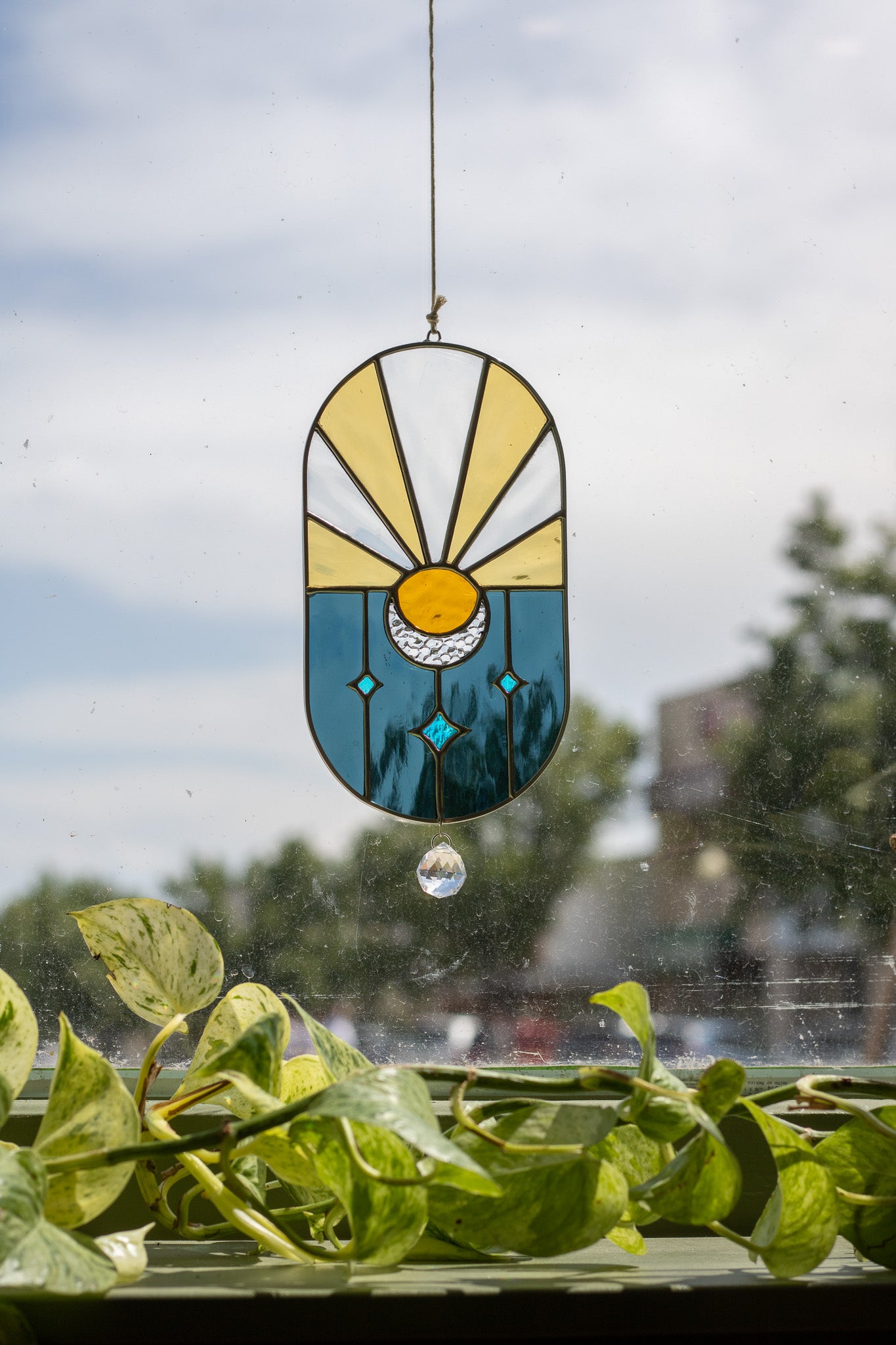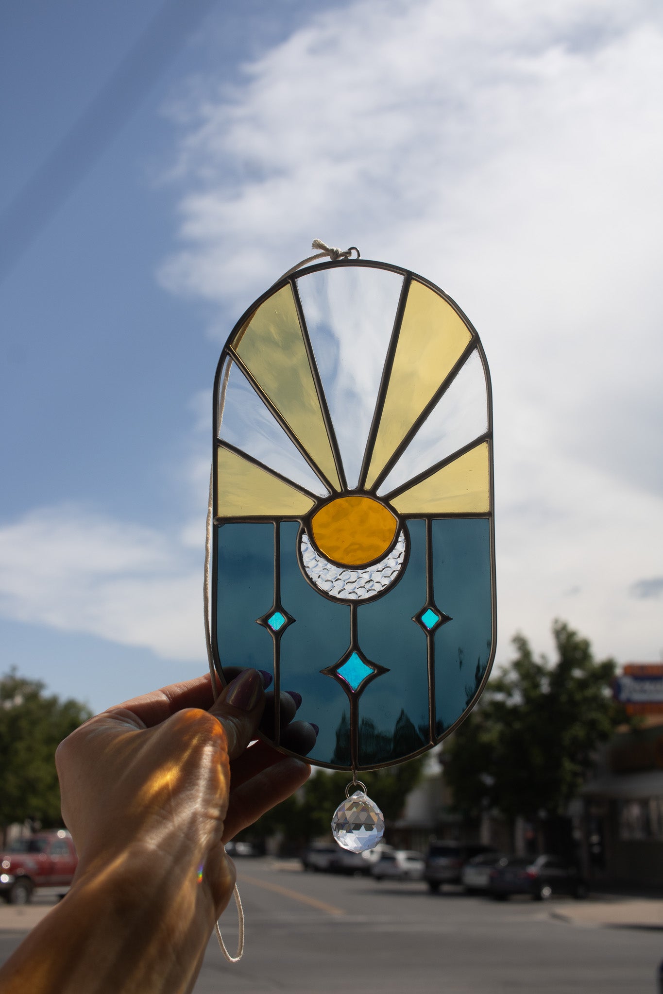 This suncatcher depicts a sun, moon and three stars. It is made with different colors of hand-cut stained glass that have been soldered together with lead-free solder and surrounded by zinc came. A small rainbow making crystal drop has been attached to the bottom of the piece and the stars are made with dichroic glass. It measures 8" inches by 4.5" inches, not including the cord it hangs from, or the crystal drop.