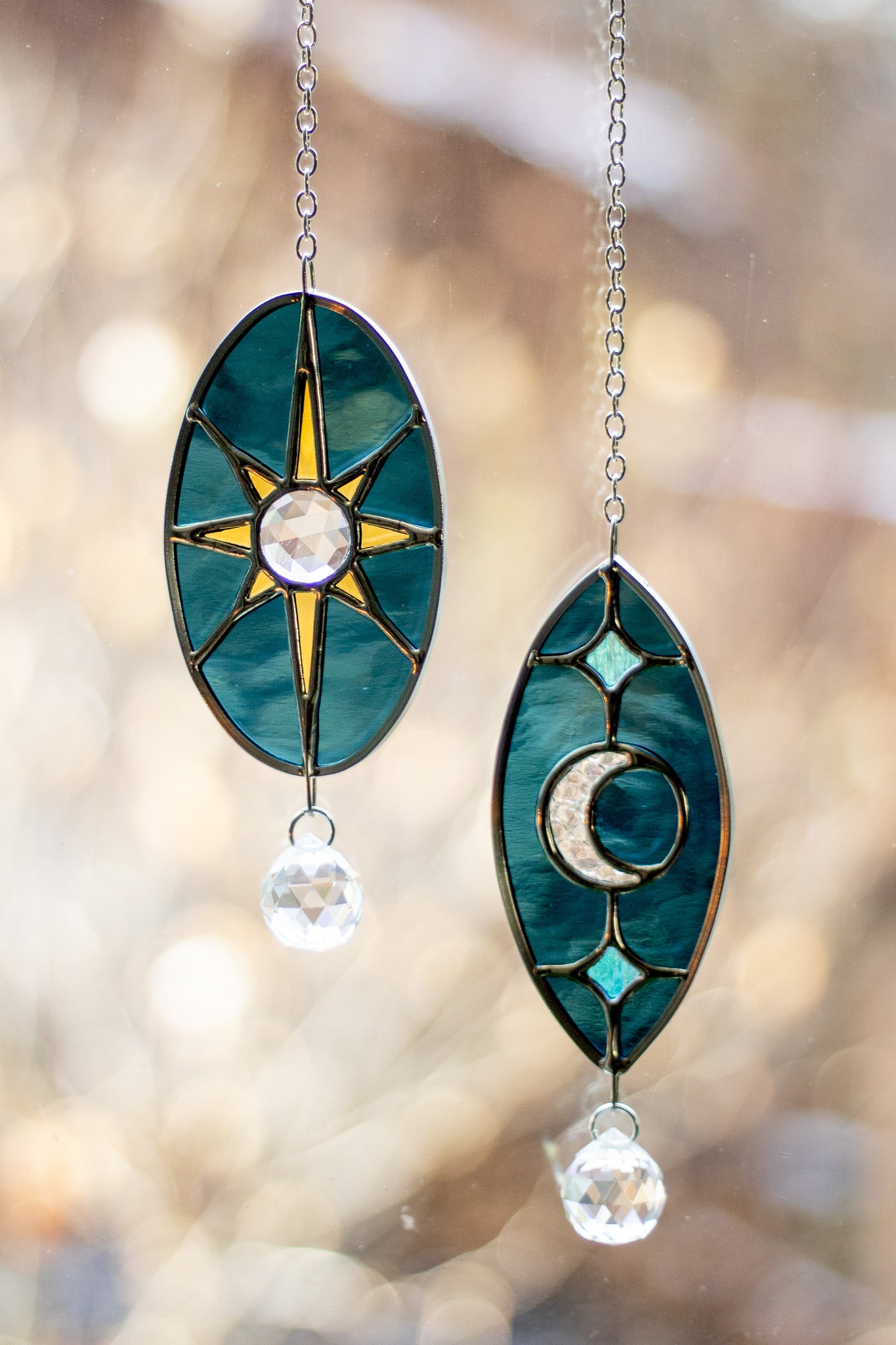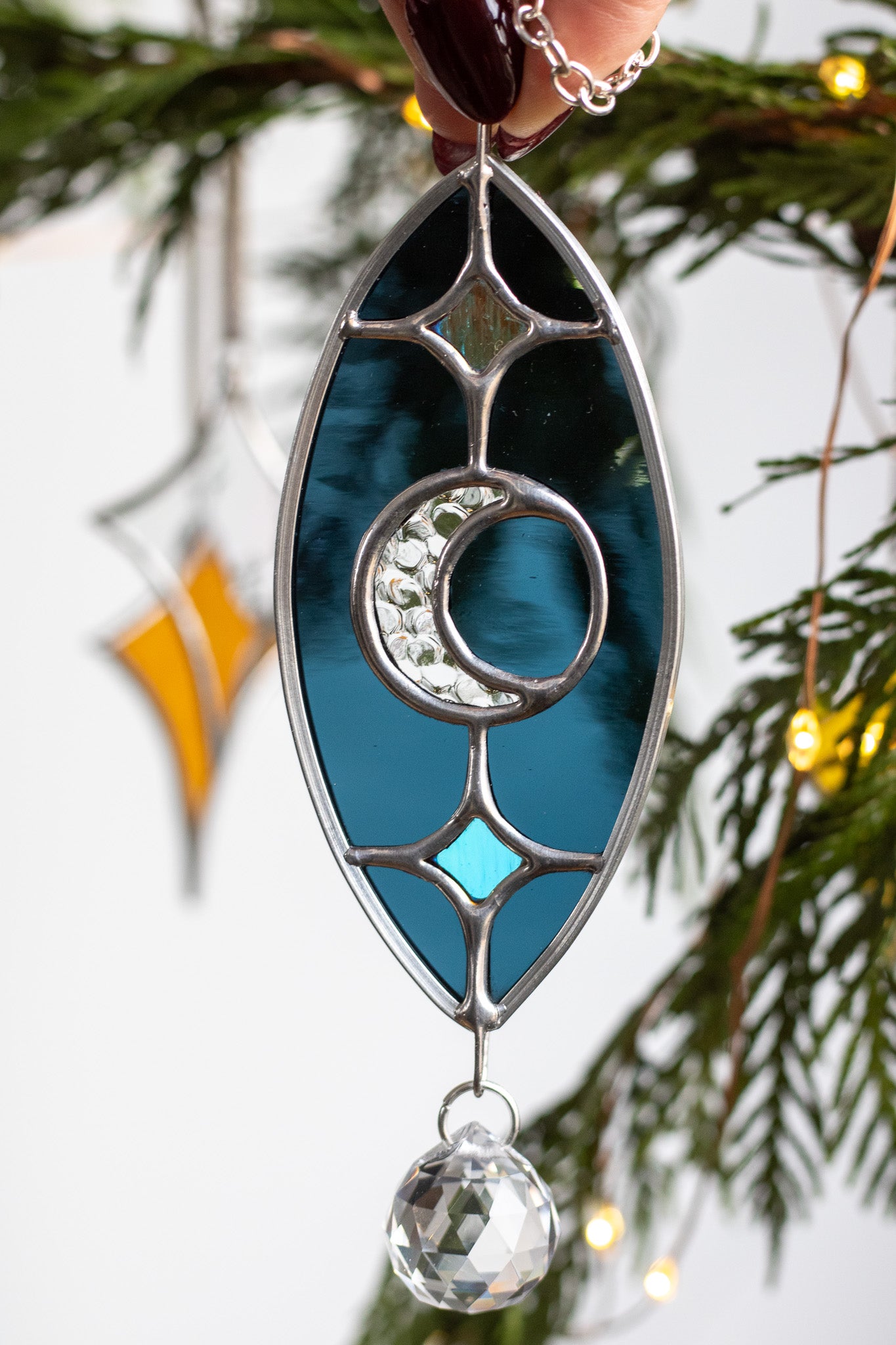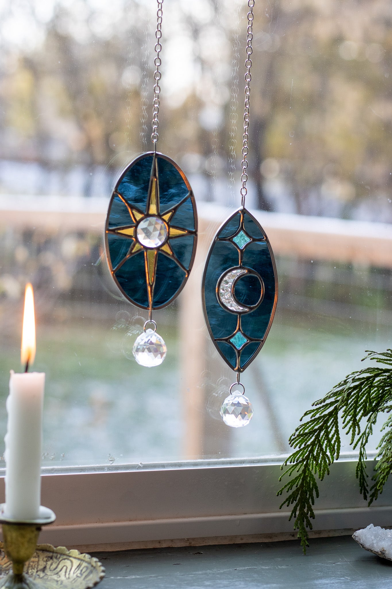 This suncatcher depicts a crescent moon and two stars. It is made with different colors of hand-cut stained glass that have been soldered together with lead-free solder and surrounded by lead free came. A small rainbow making crystal drop has been attached to the bottom of the piece and the stars are made with dichroic glass. It measures 4.5" long by 2" wide, not including the chain it hangs from, or the crystal drop. With the chain and drop it measures 10" long.
