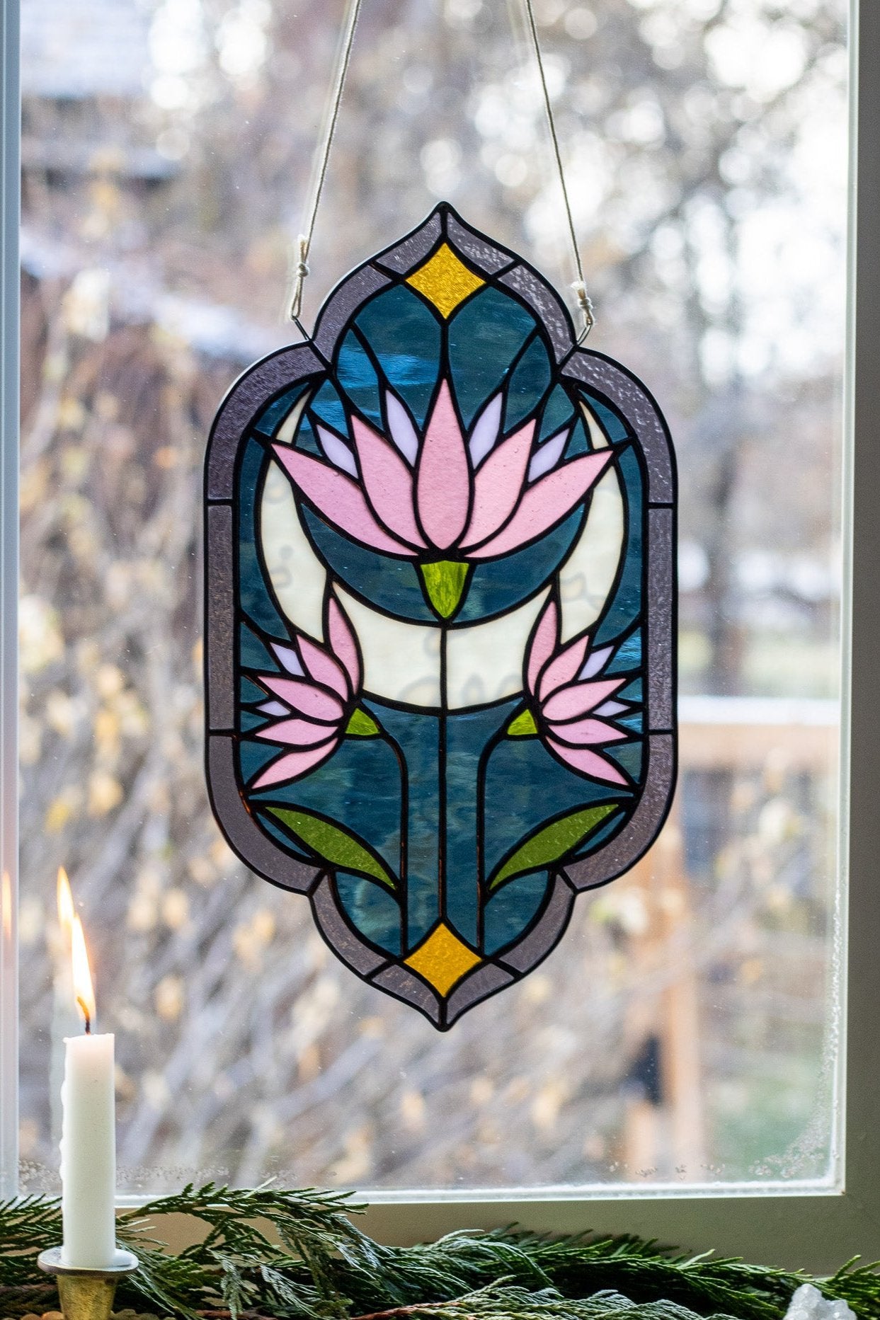 This suncatcher depicts three purple thistle flowers in a night sky with a crescent moon and stars. It is made with lead-free solder and a lead free came border that has been antiqued black. It measures 12.75 inches by 7.5 inches, not including the cord it hangs from.