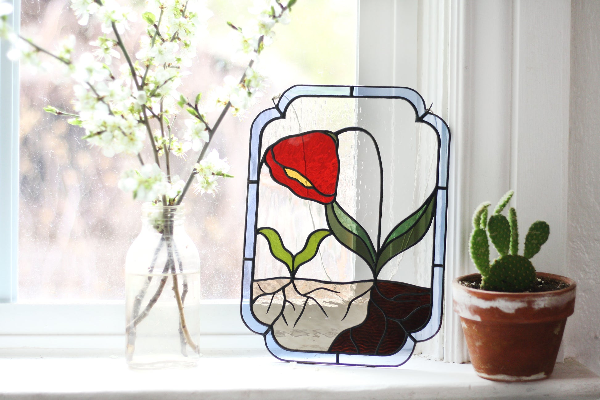 This suncatcher depicts a red poppy flower protecting her seedling from the rain. When I started sketching this piece out I was thinking about parenthood and how we will do anything to protect our babies from discomfort. But as I started drawing the roots I realized that this mama was keeping her seedling from getting the water it needed to grow. As a parent, the thing I struggle with the most is finding a balance between protecting and preventing growth. Sometimes we just need to sit with them through the rainstorm rather than keeping them dry.