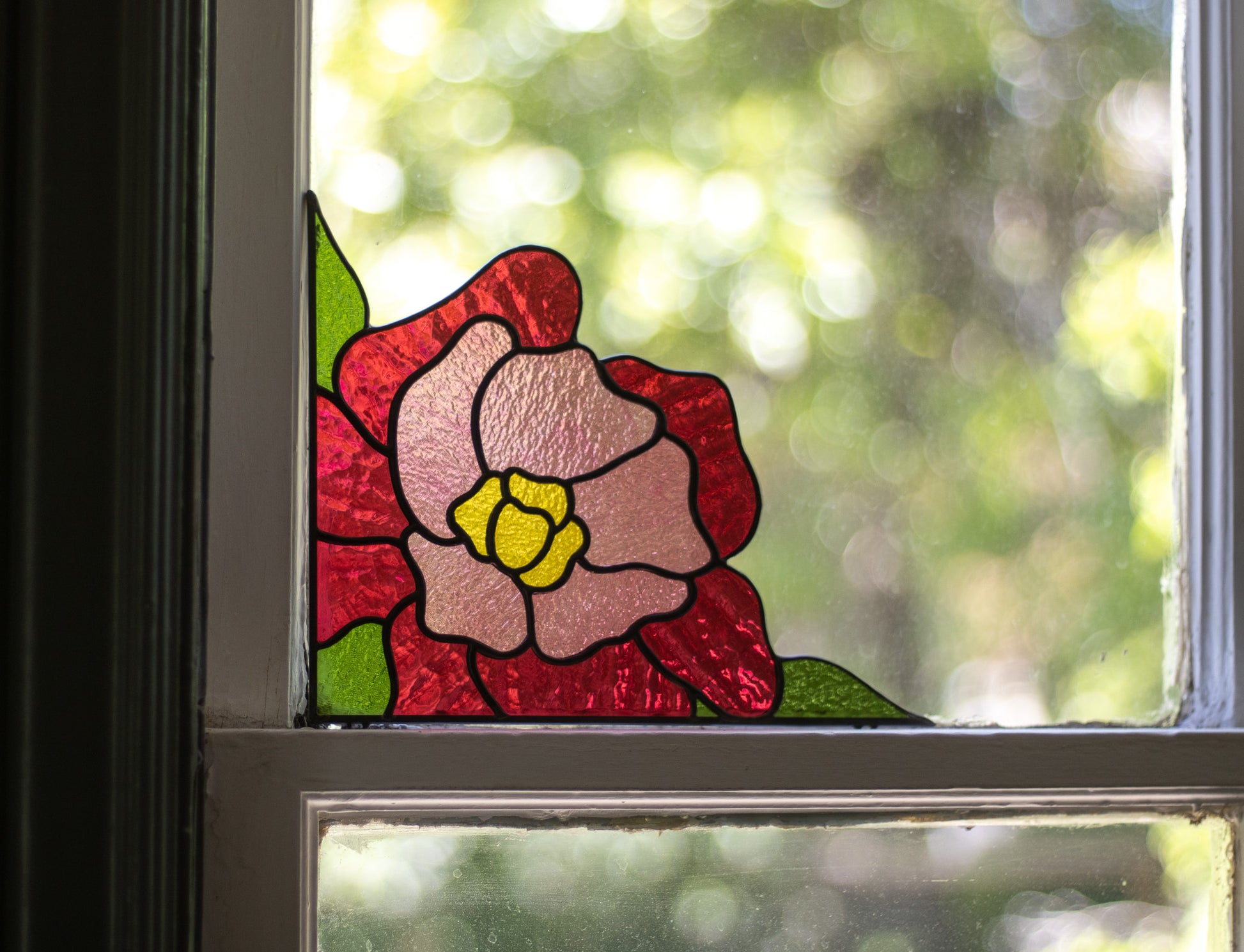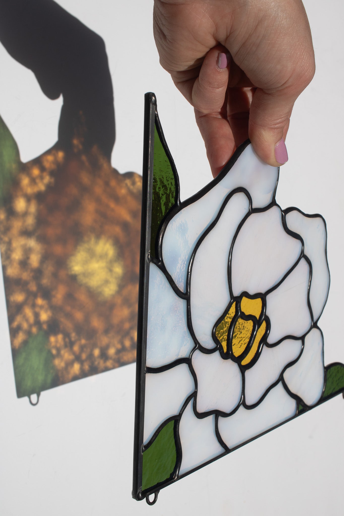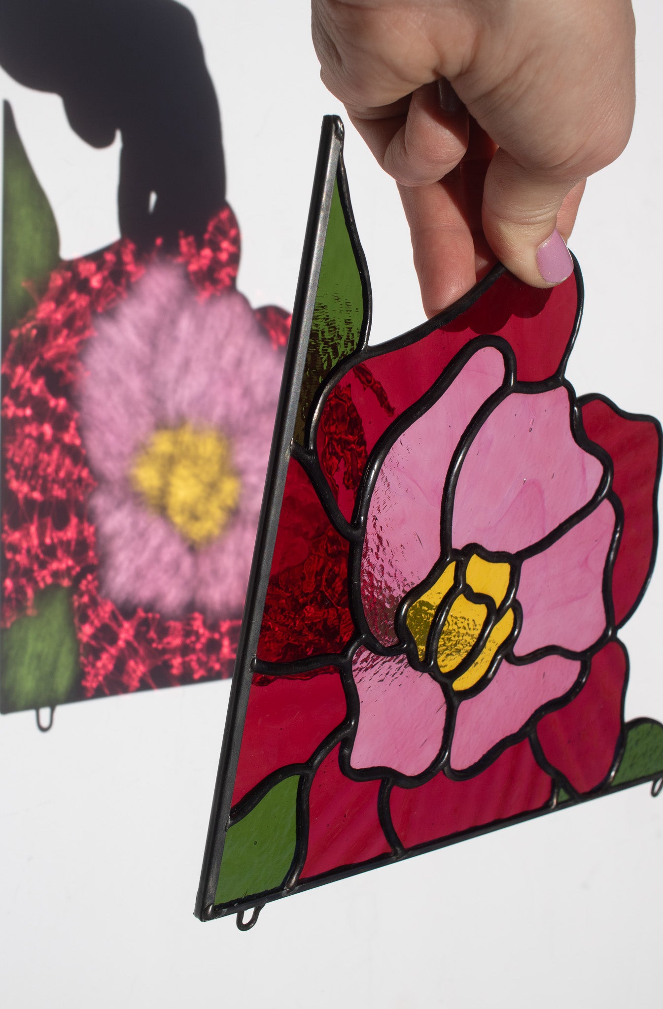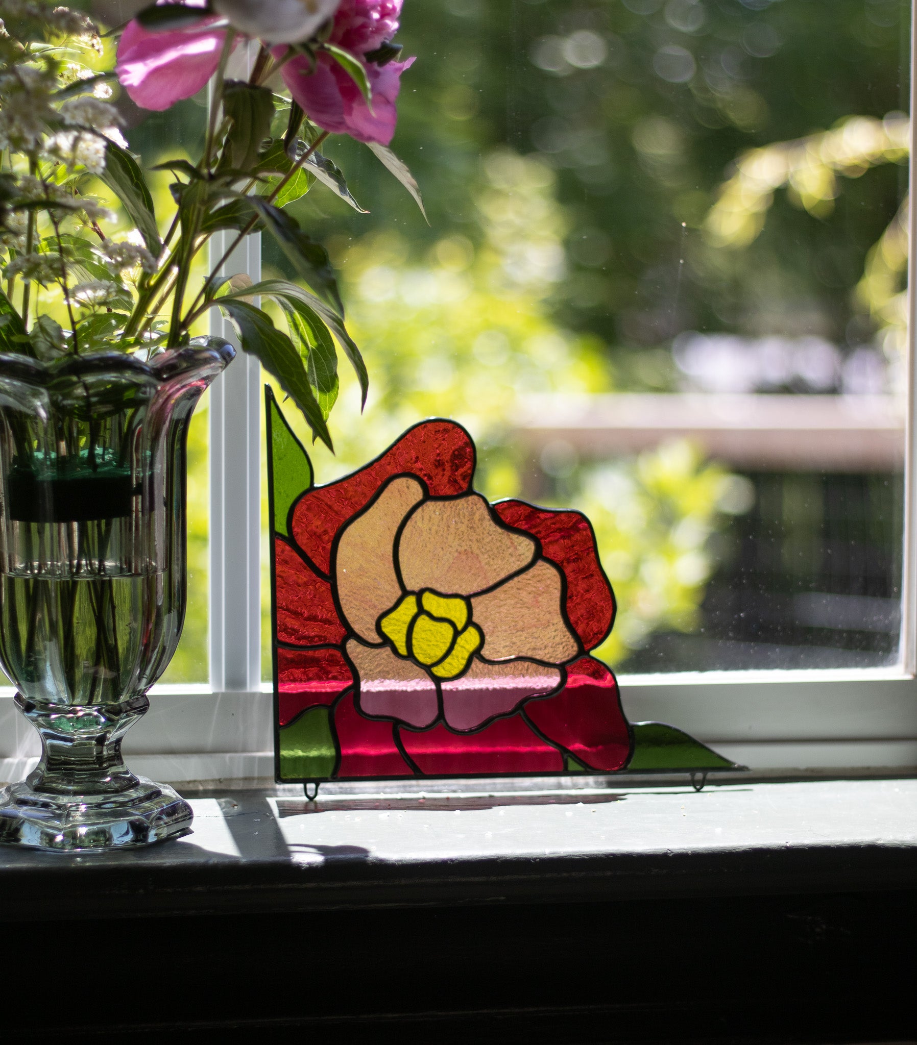 This corner hanger depicts a peony flower. It is made with different colors of hand-cut stained glass that have been soldered together with lead-free solder and surrounded by zinc came that has been antiqued black. It measures 9 inches by 7.5 inches.