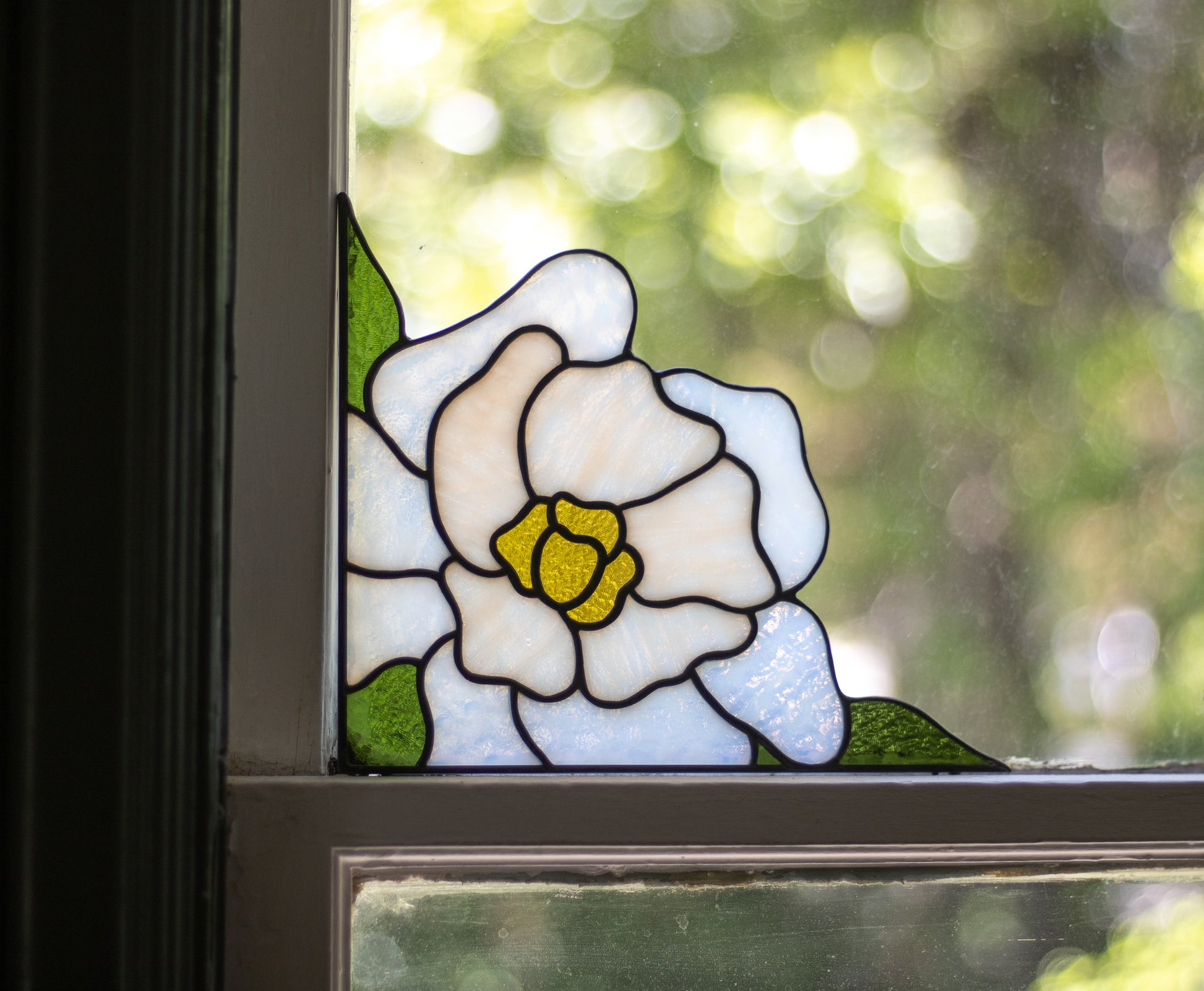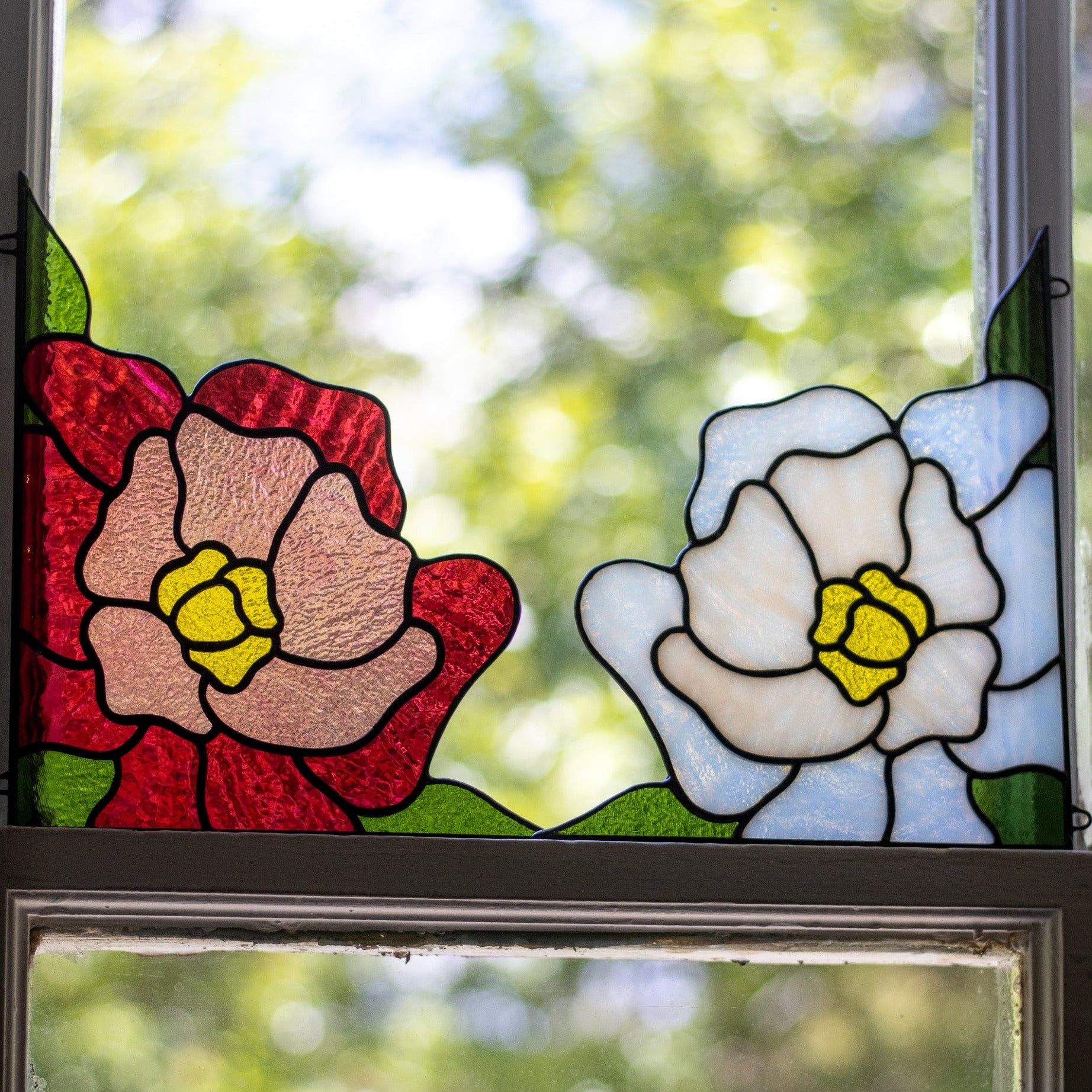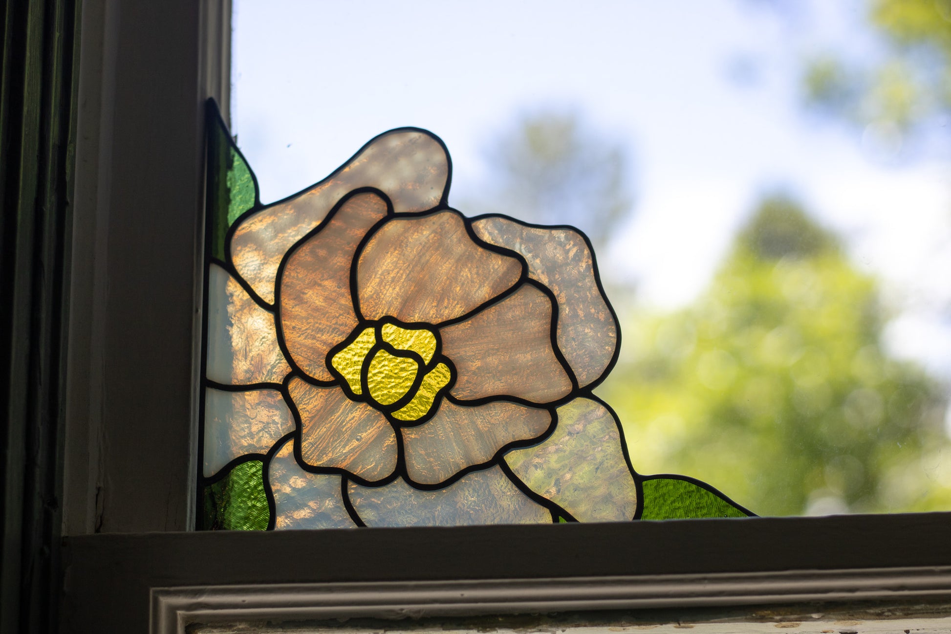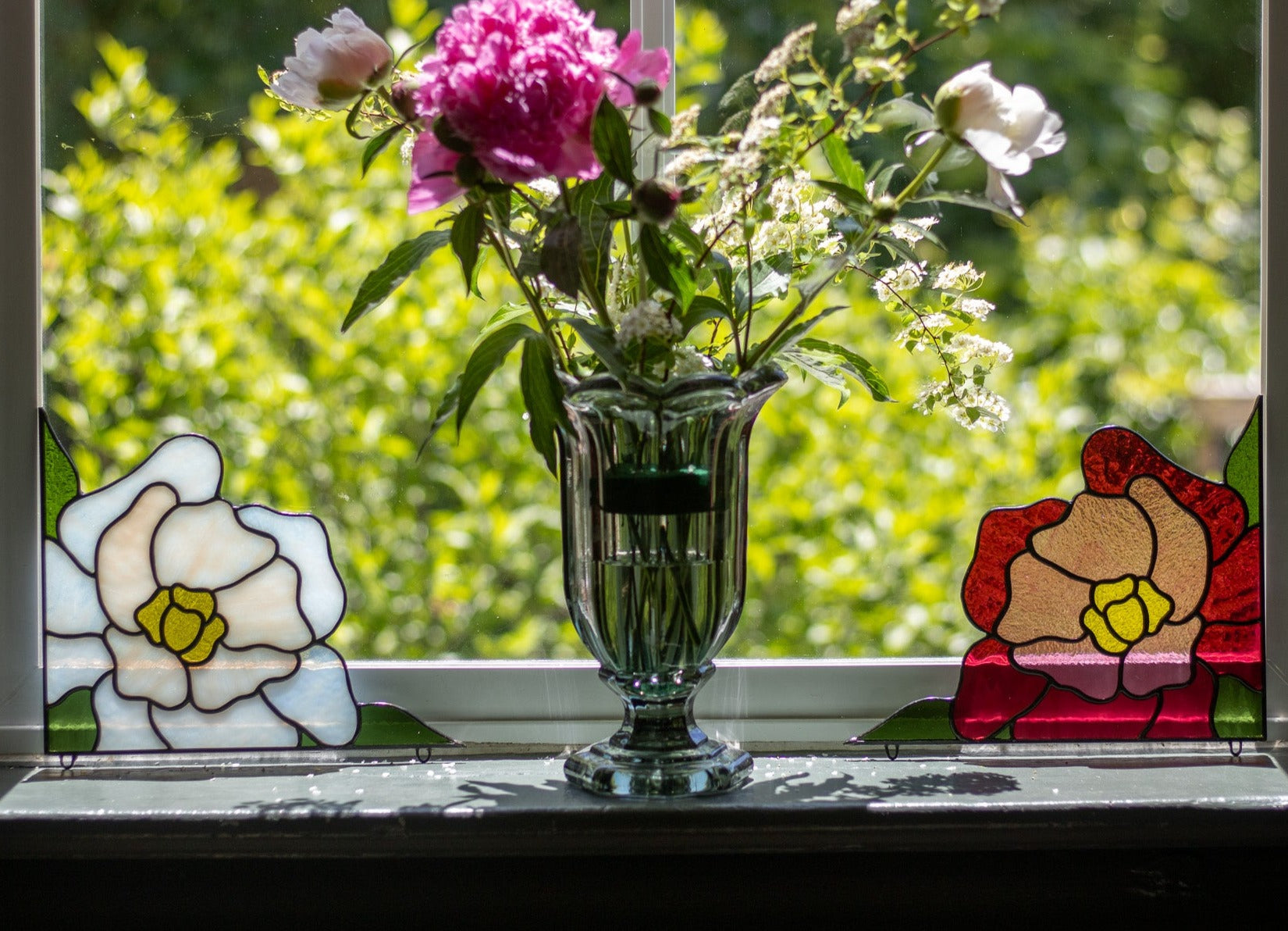 This corner hanger depicts a peony flower. It is made with different colors of hand-cut stained glass that have been soldered together with lead-free solder and surrounded by zinc came that has been antiqued black. It measures 9 inches by 7.5 inches.