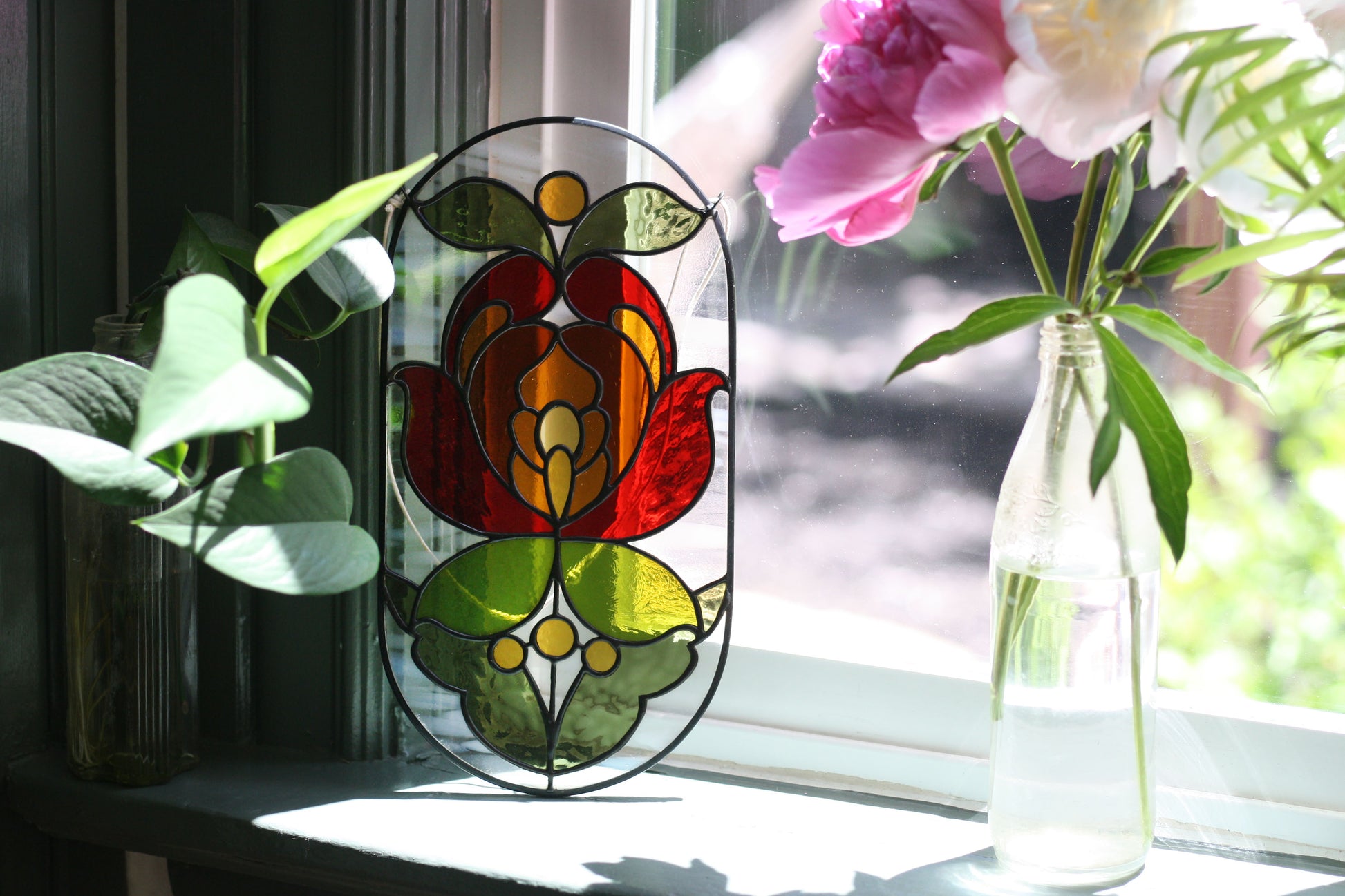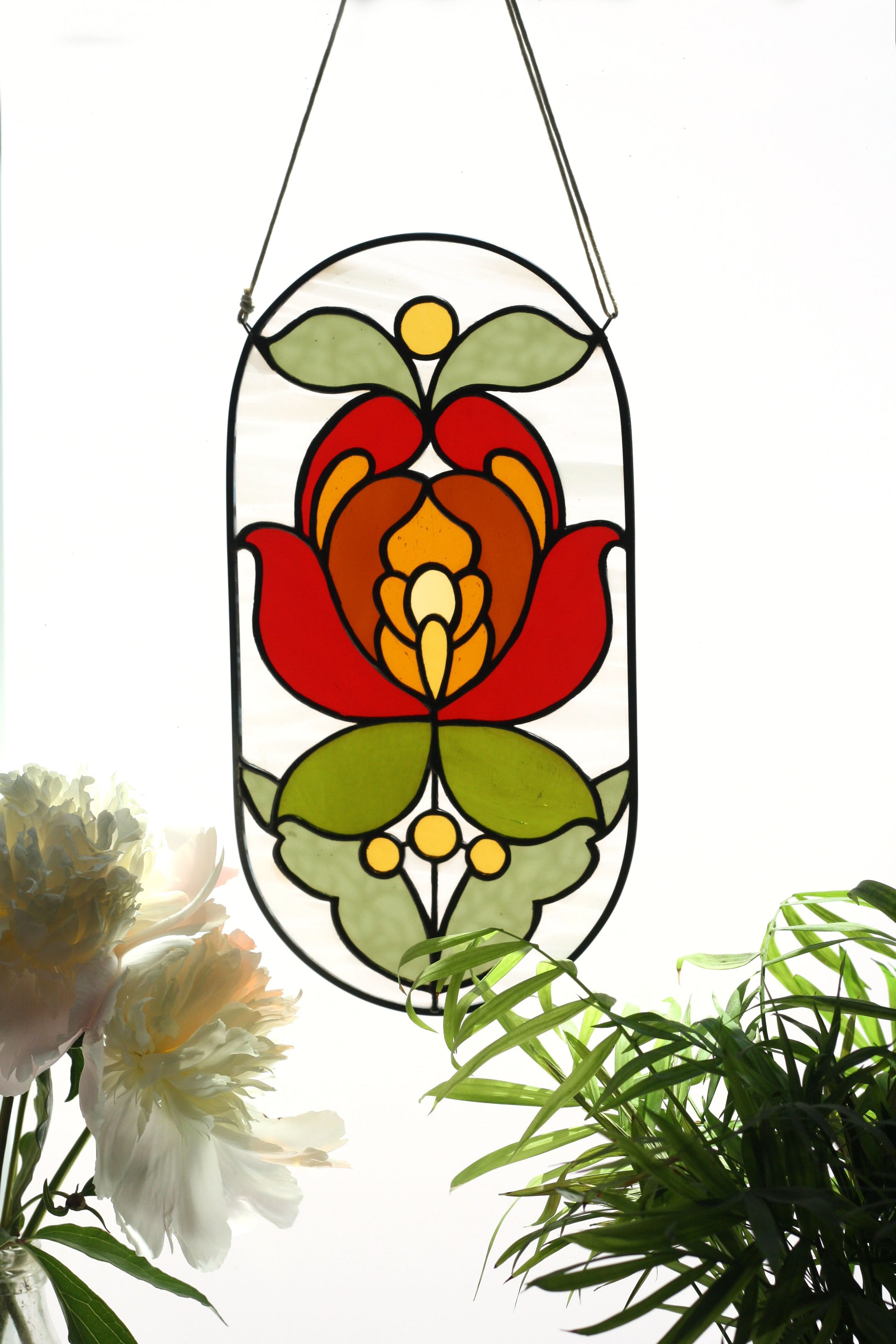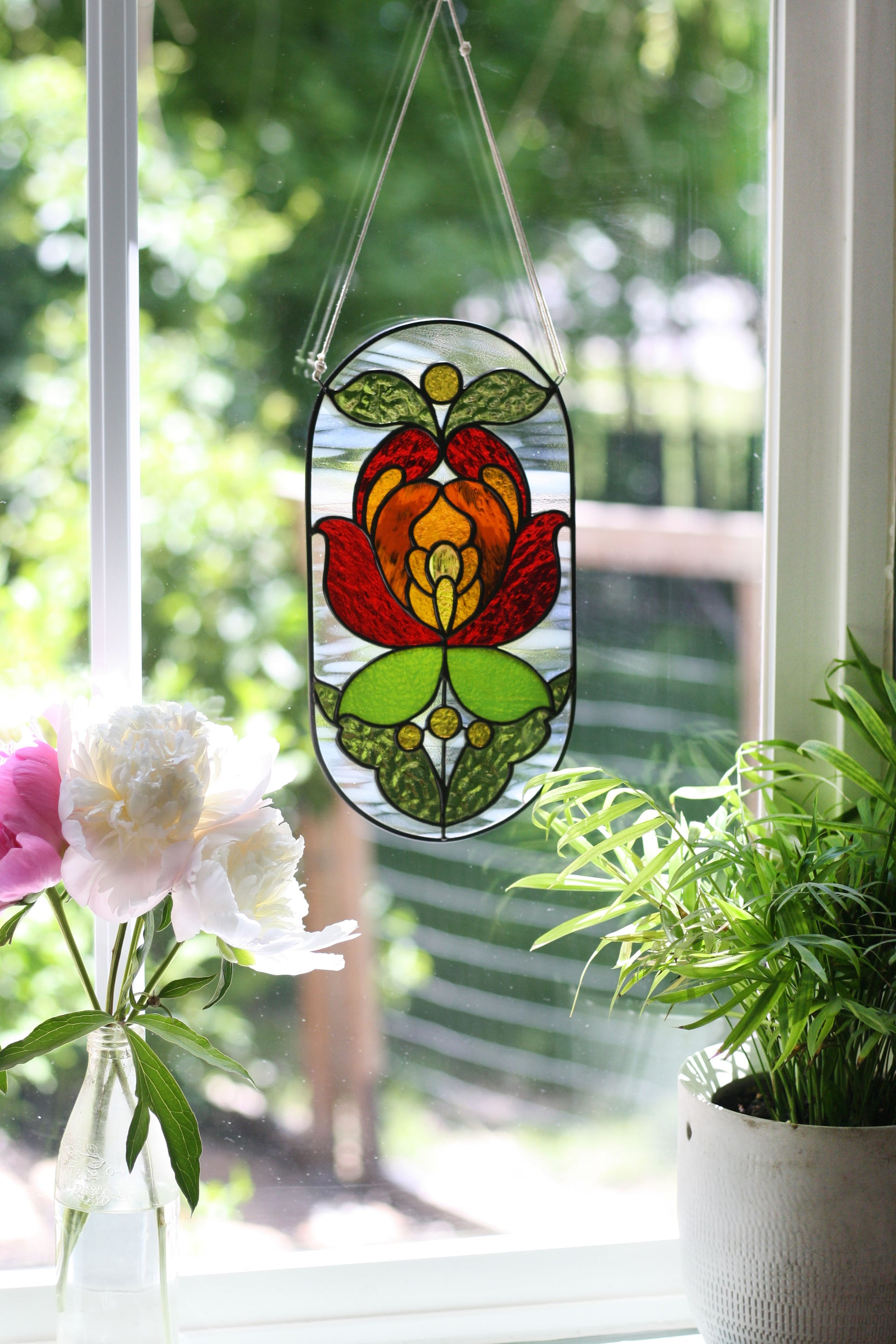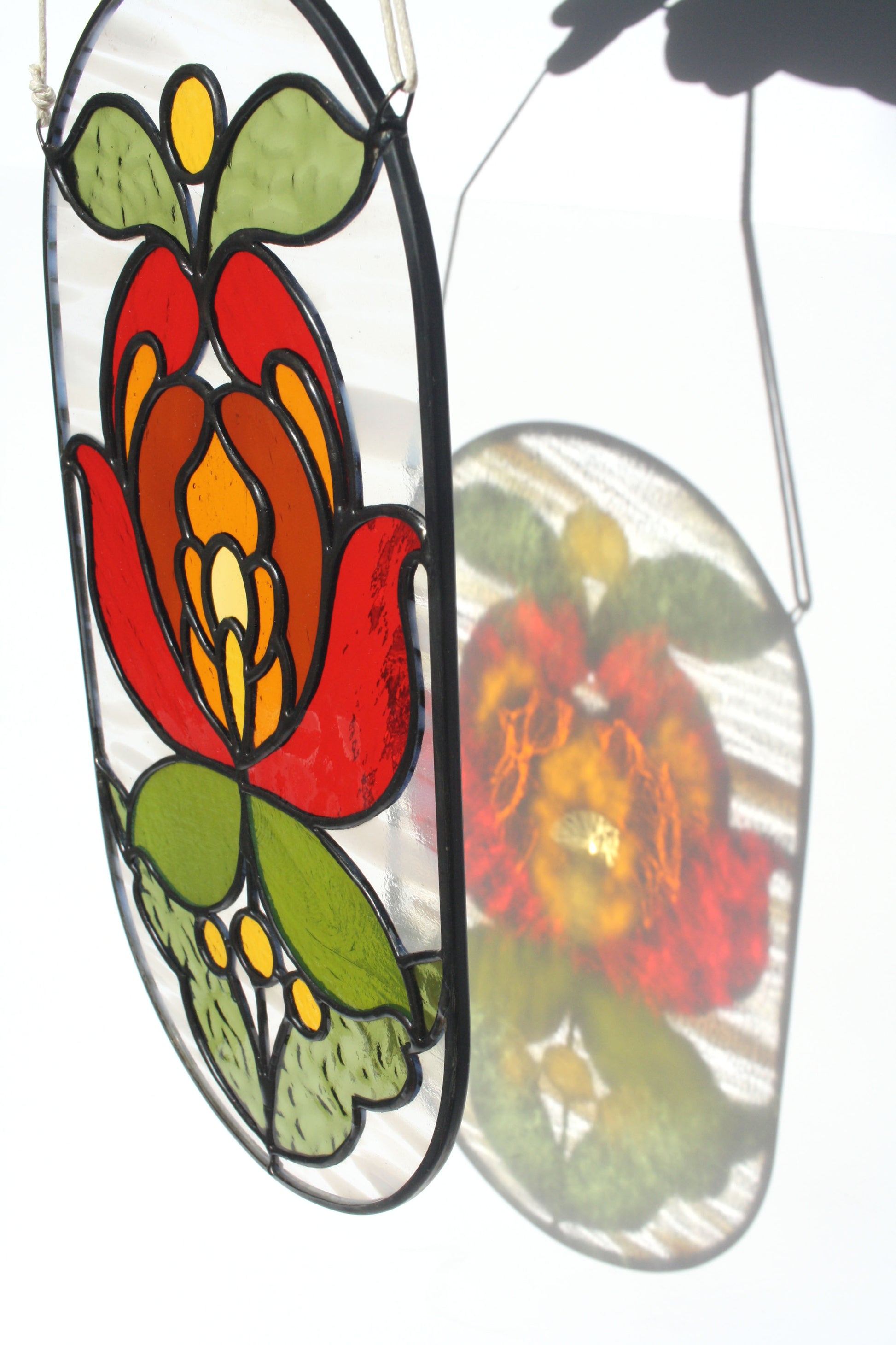 This suncatcher depicts flowers in the Petrykivka style with various colors of transparent stained glass. It is soldered with lead-free solder and framed in zinc came that has been antiqued black. It measures 10 inches by 5.5 inches, not including the cord it hangs from.