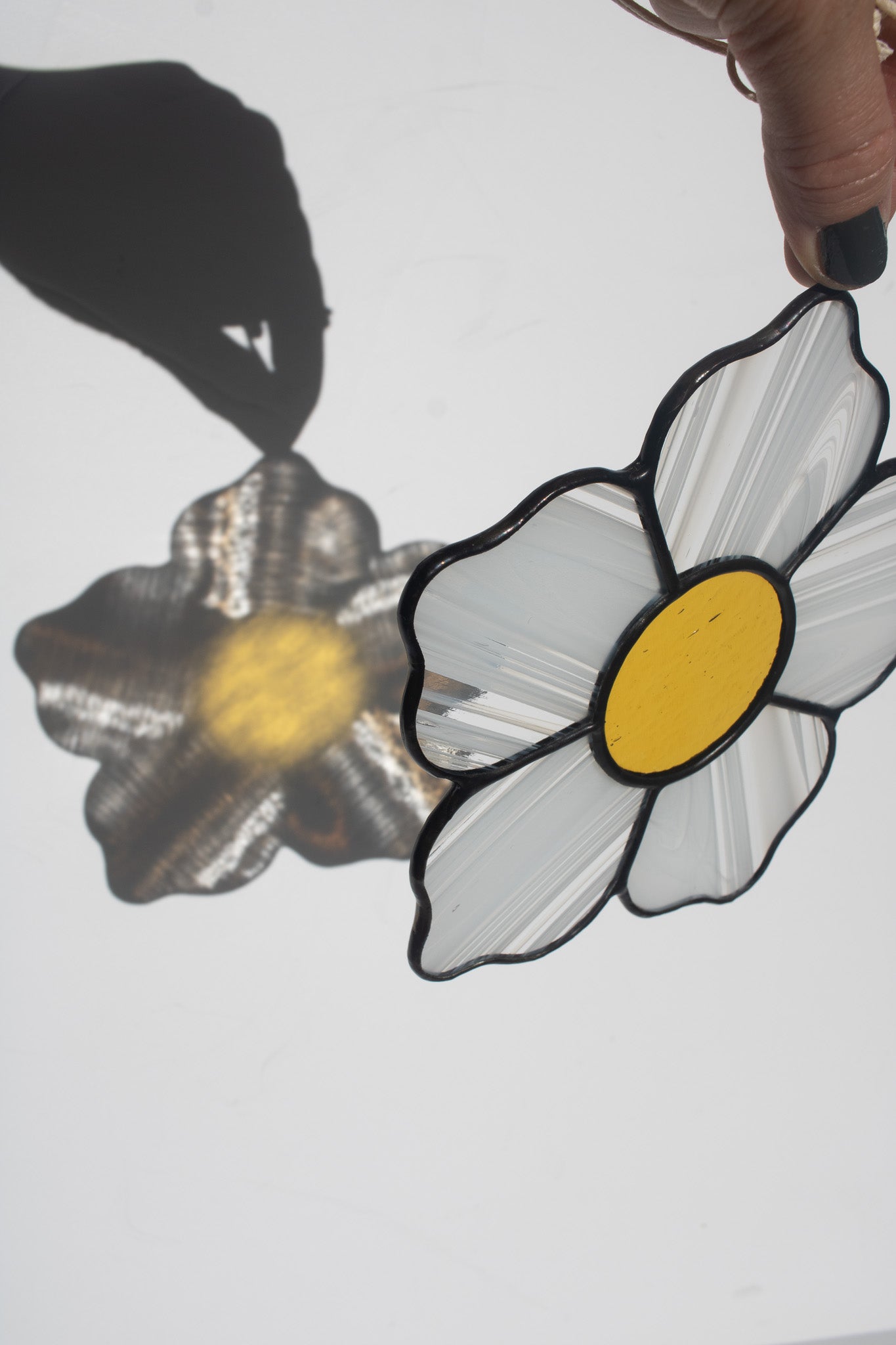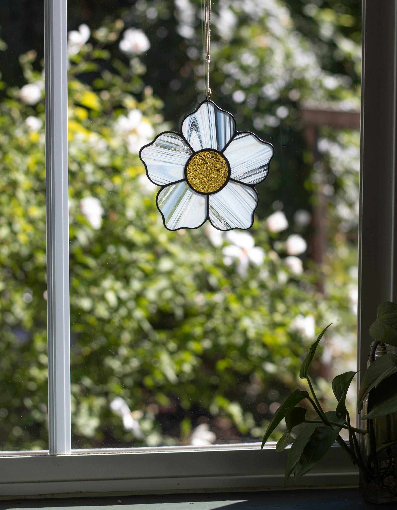 This sun catcher depicts a simple flower with clear baroque glass for the petals and light amber glass for the center with a rainbow maker crystal hanging from the bottom. It is soldered together using lead free solder with a black patina finish. This sun catcher measure 5.5 inches in diameter not including the cord it hangs from.