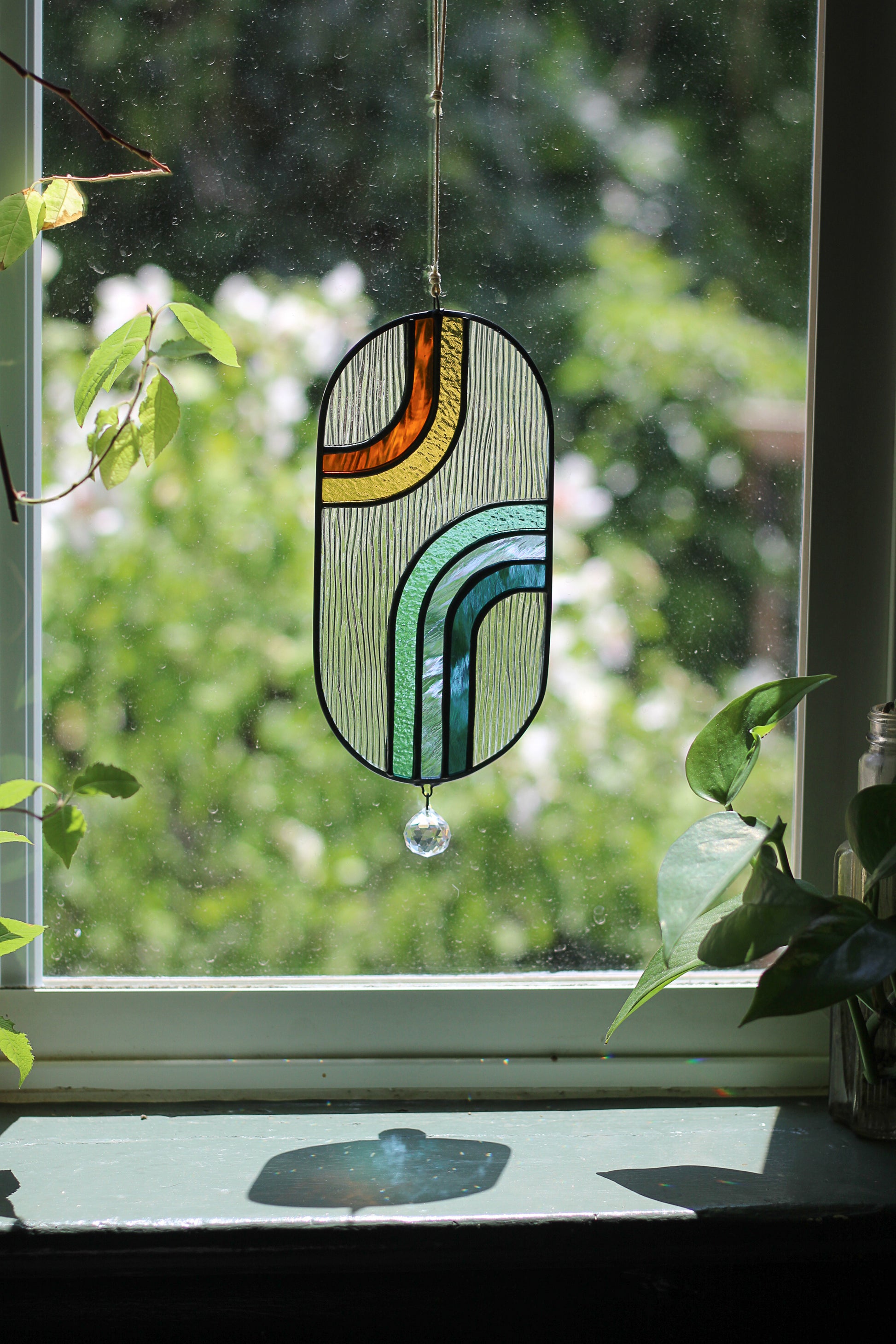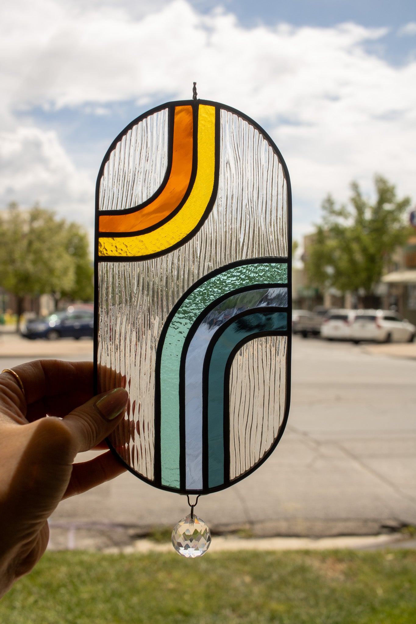 This suncatcher is in a pill shape with amber, yellow, teal, and blue glass stripes coming from separate directions. It is made with different colors of hand-cut stained glass soldered with lead-free solder and framed in lead-free came. It has a rainbow making crystal attached to the bottom of it. It measures 8 inches by 4 inches, not including the cord it hangs from.